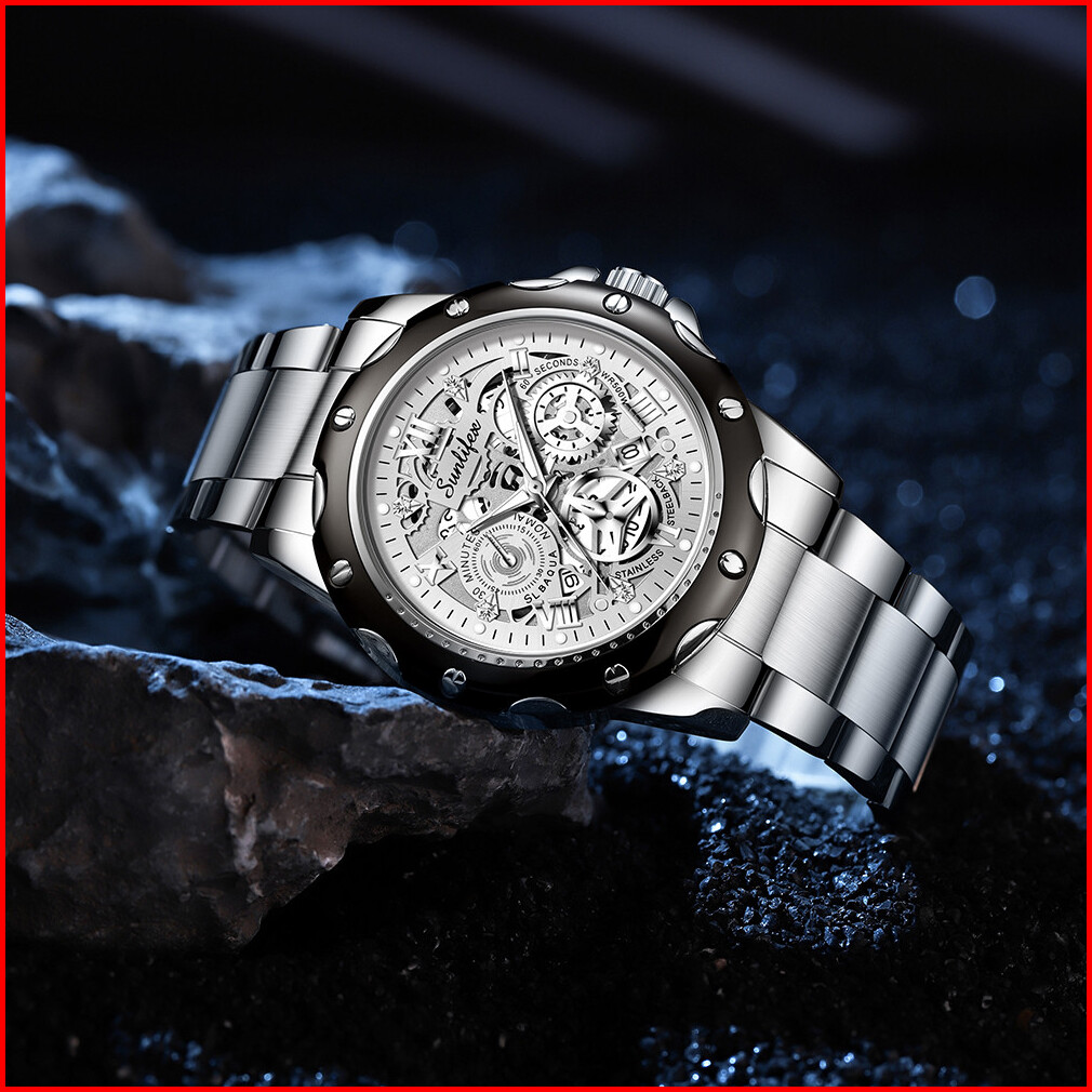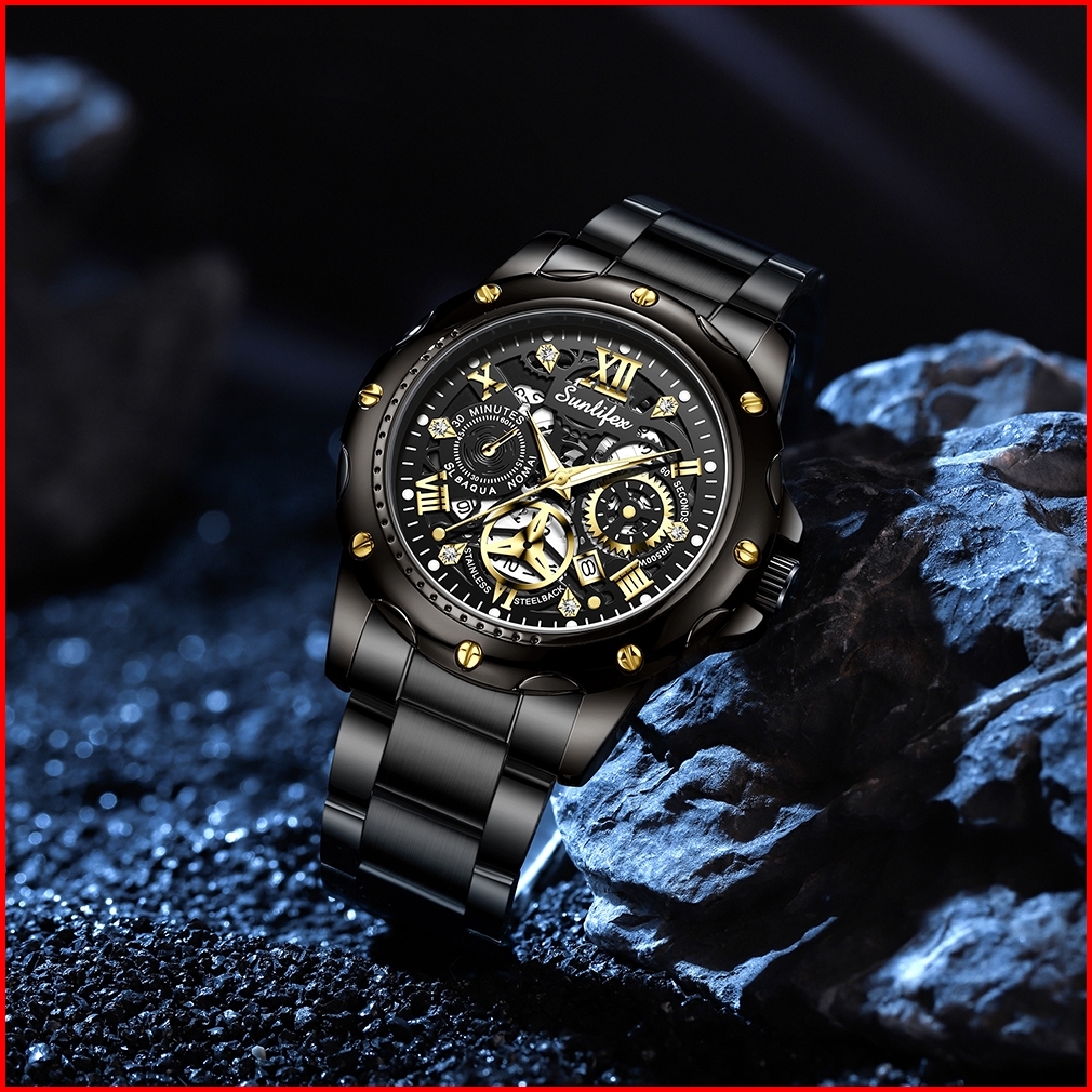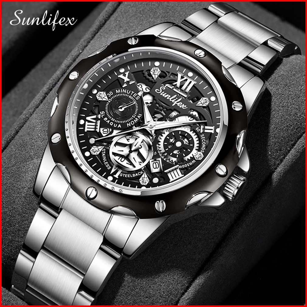 Sunlifex Jam Tangan Pria Kuarsa Luminous Tanggal Kasual Tali Stainless Steel Jam Tangan Cowok 8080