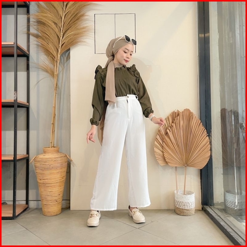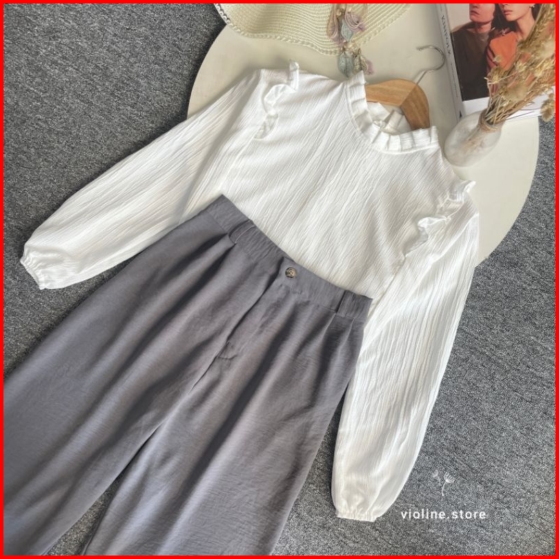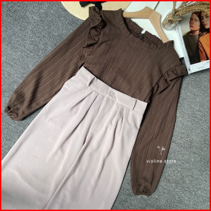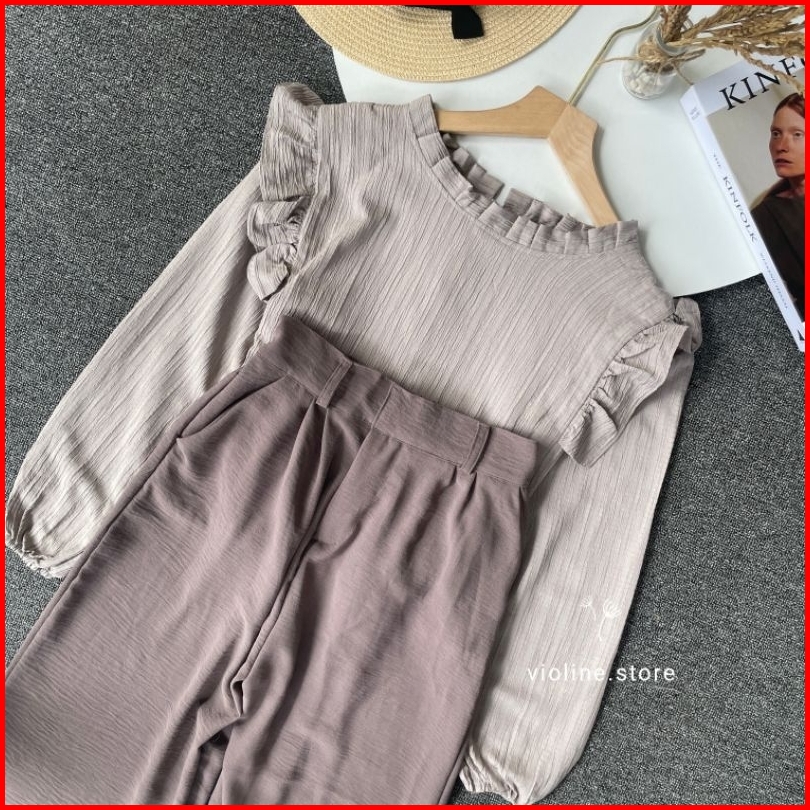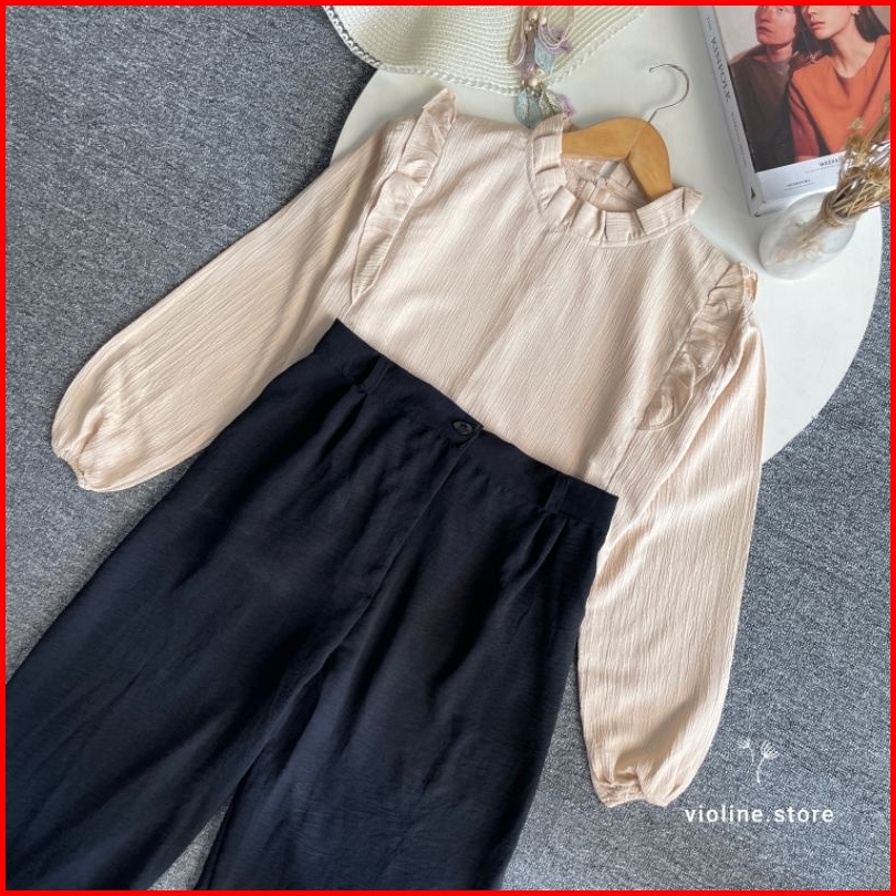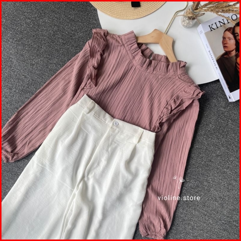 Violine Store - Oneset Setelan Wanita Remaja Kekinian Celana Panjang Kemeja Ruffle Ladycrush Kulot Crinckle Hijab Friend