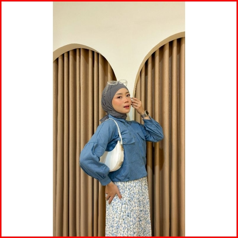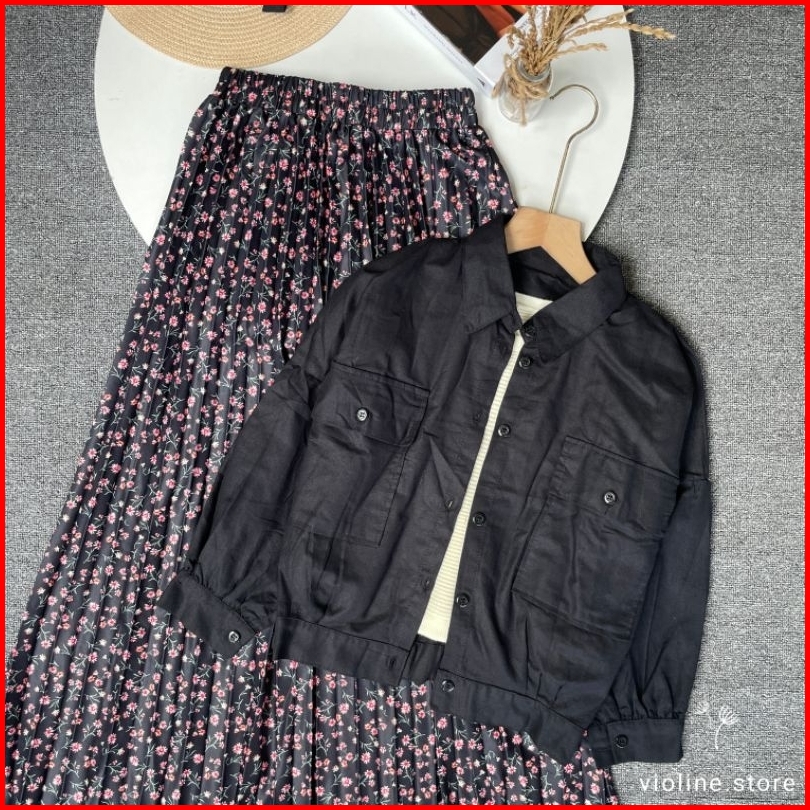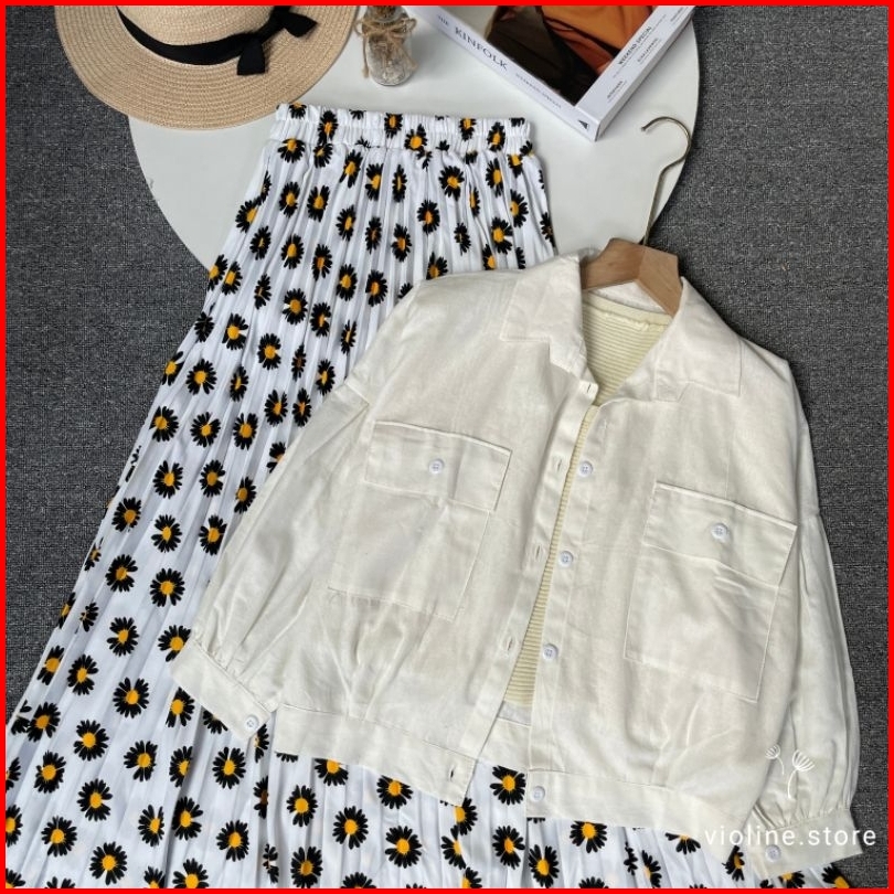 Violine Store - Oneset Setelan Wanita Remaja Kekinian Kemeja Linen Mix Rok Motif Plisket Bunga Setelan Rok Panjang Simpl