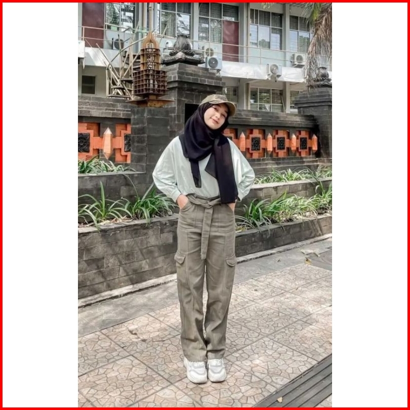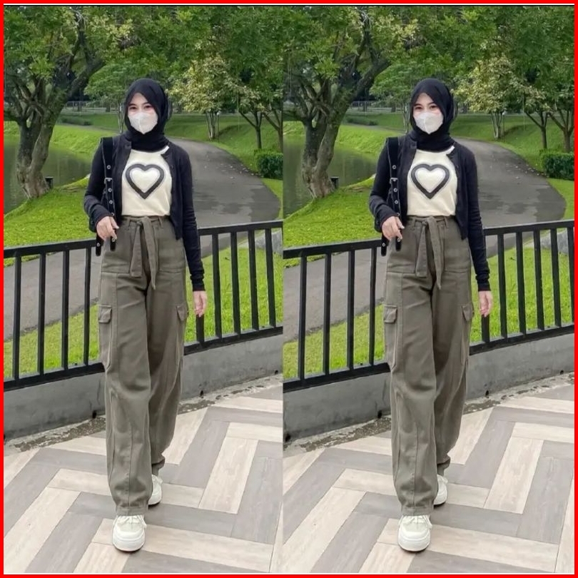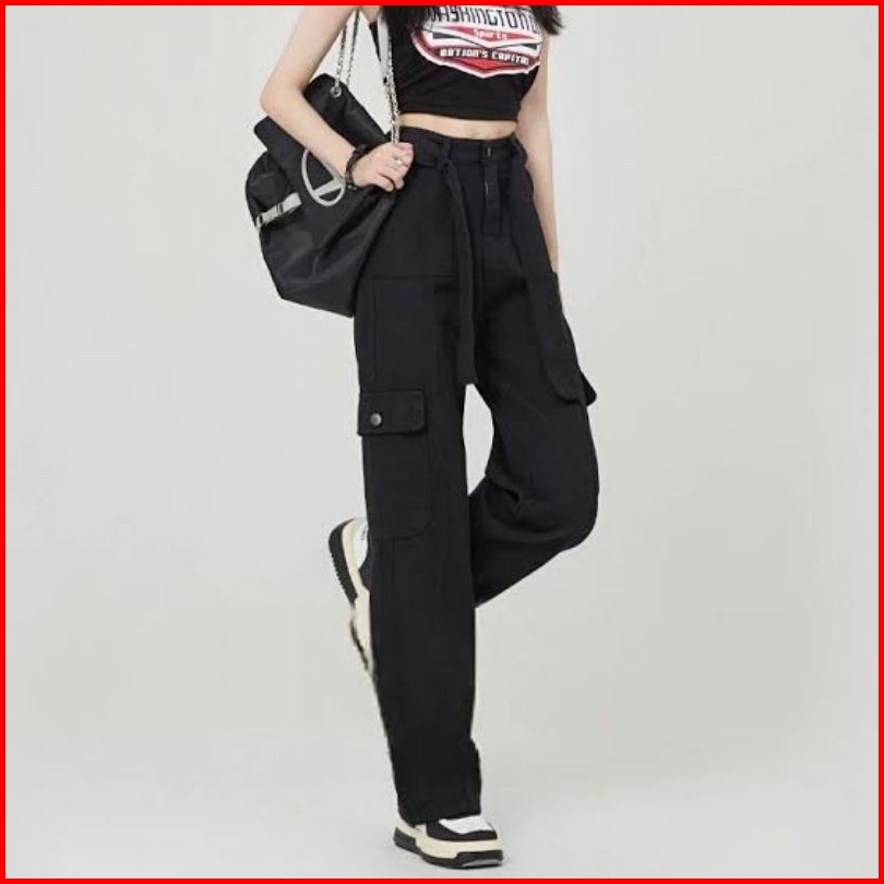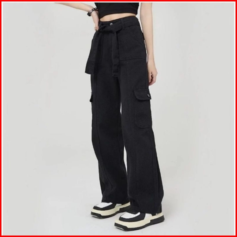 Ralin - Celana J41 Cargo Tali High Waist Celana Cargo Tali Pinggang Wanita Celana Cargo Kimpul Wanita Loose Korean Style