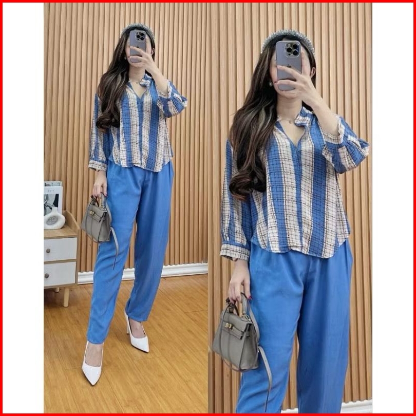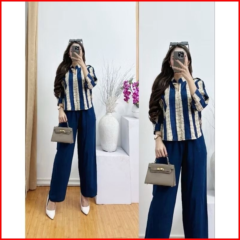 Set Kemeja Salur Murah Lengan Panjang One Set Salur Kekinian Setelan Salur Bangkok Setelan Rayon Santung Premium