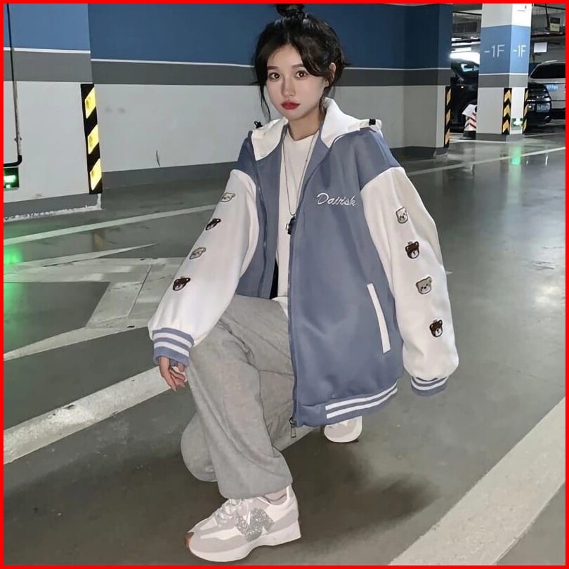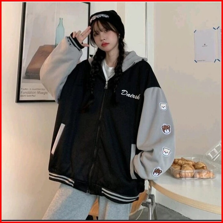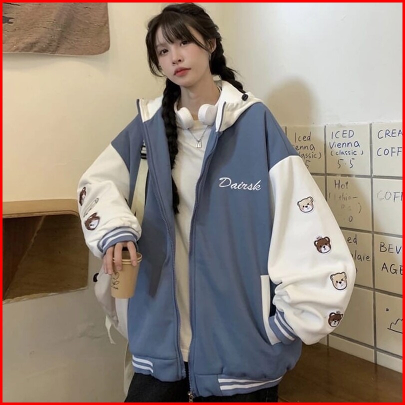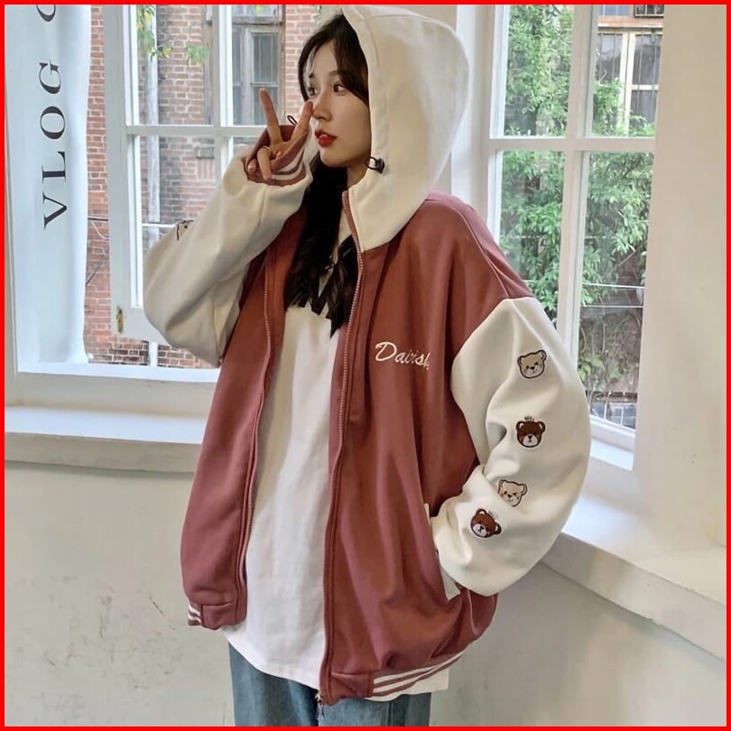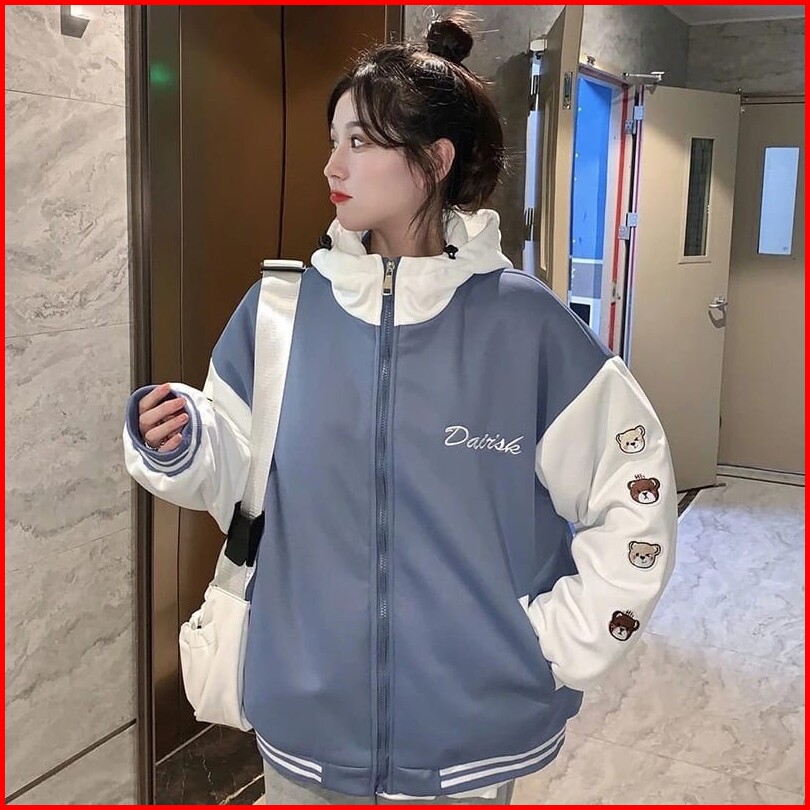 Femes Dairsk Bear Ziper Hoodie Outerwear Wanita Remaja Matt Fleece Sablon Tebal Premium Ootd Korean Style