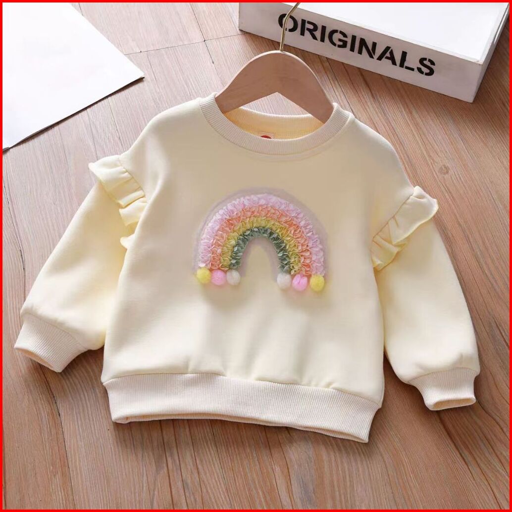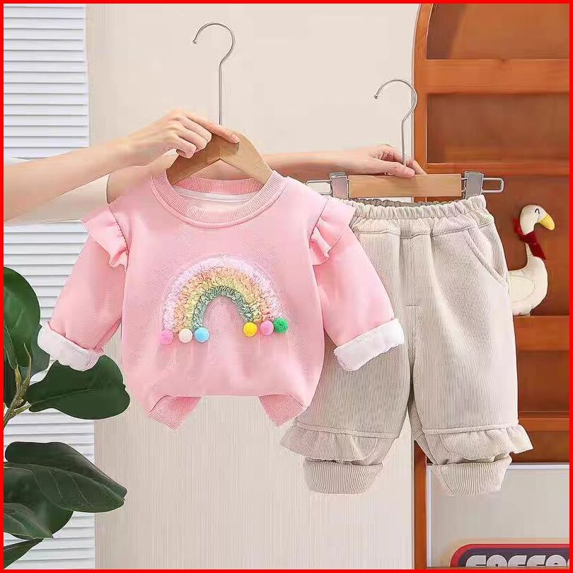 Setelan Anak Abu-abu Dengan Renda Hiasi Baju Setelan Pola Pelangi Anak Perempuan 1-4thn