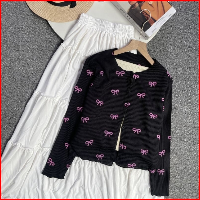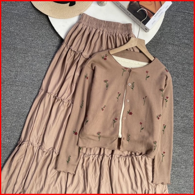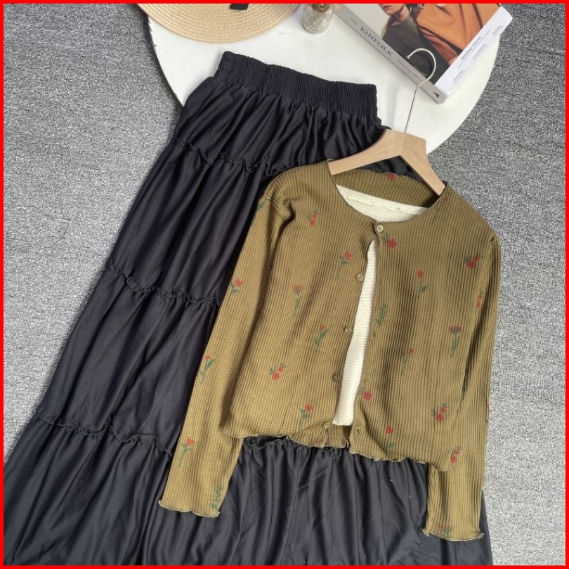 Violine.store - Oneset Setelan Wanita Kekinian Setelan Rok Panjang Cardi Crop Motif Pita Bunga Rok Stack Polos Outfit He