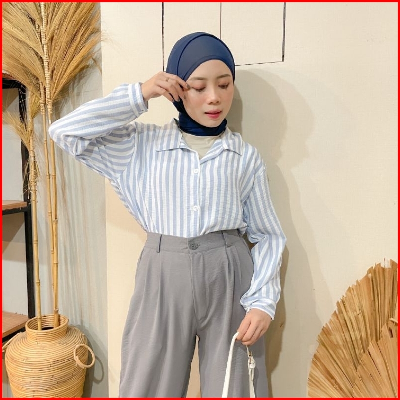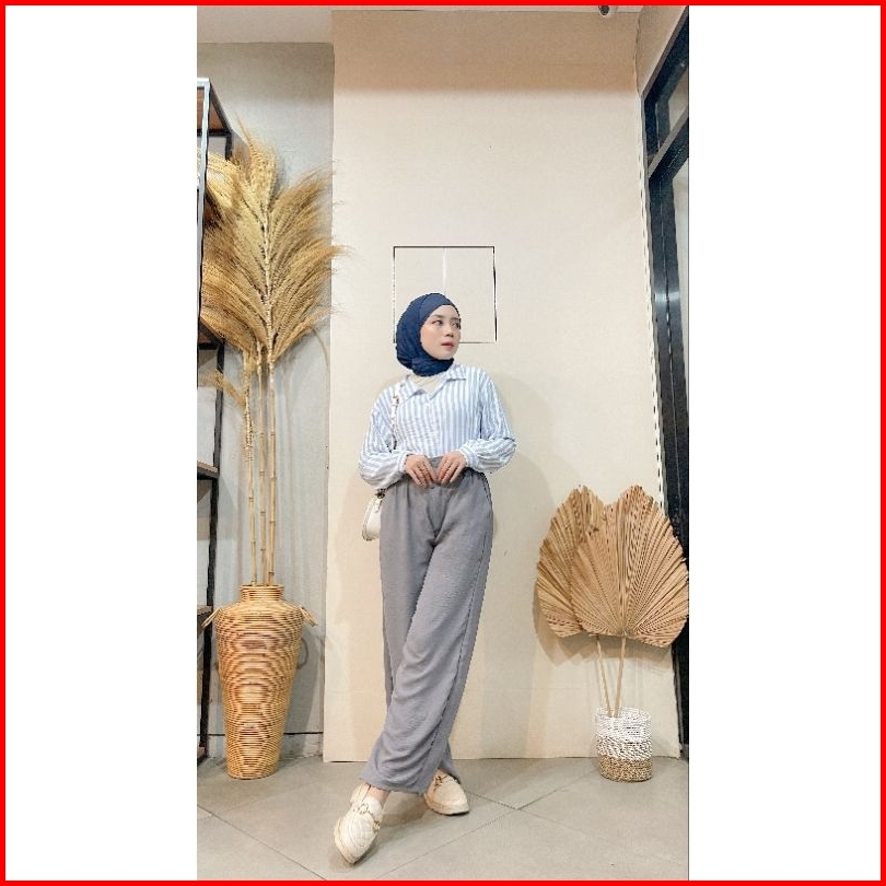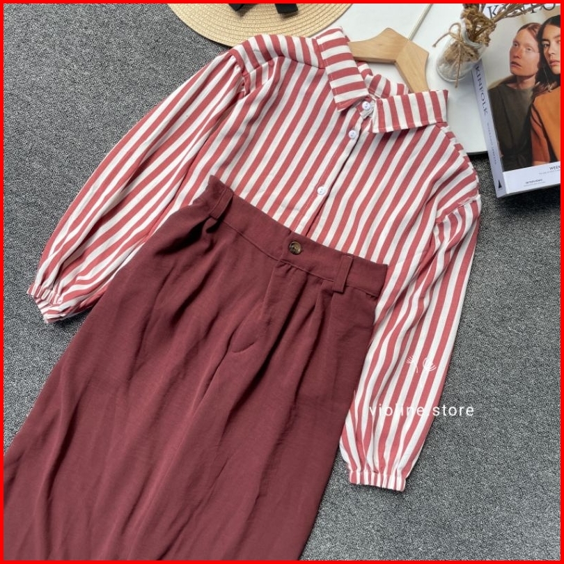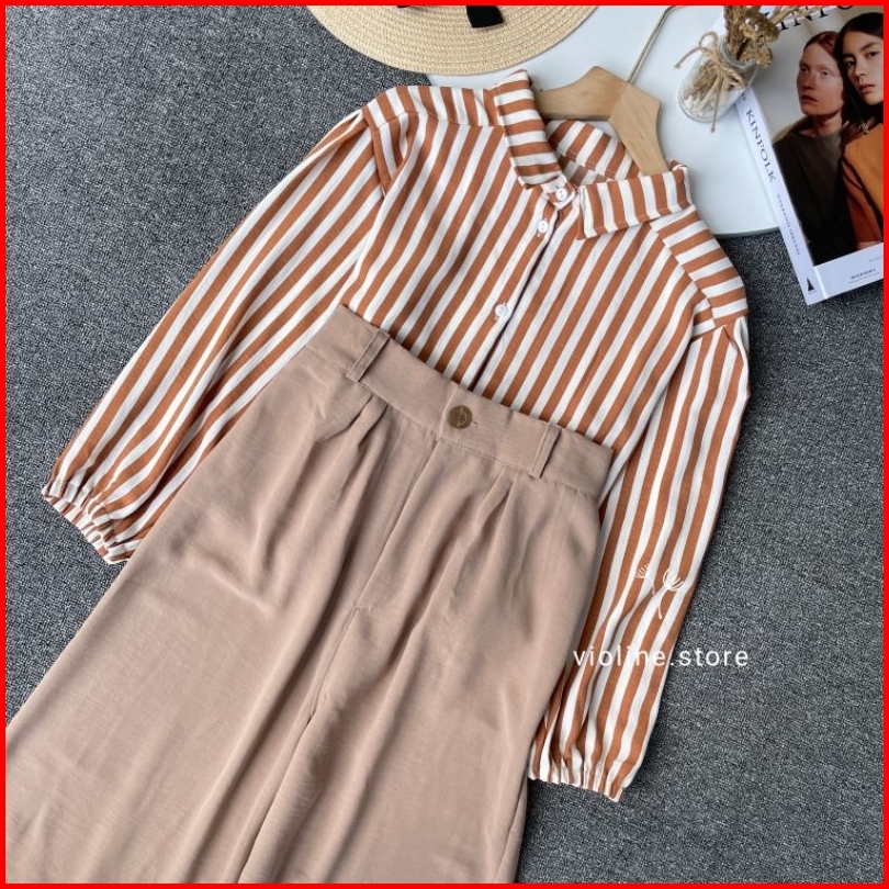 Violine Store - Oneset Setelan Wanita Kekinian Celana Panjang Kemeja Stripy Celan Crinckle Airflow Outfit Ngantor Kuliah