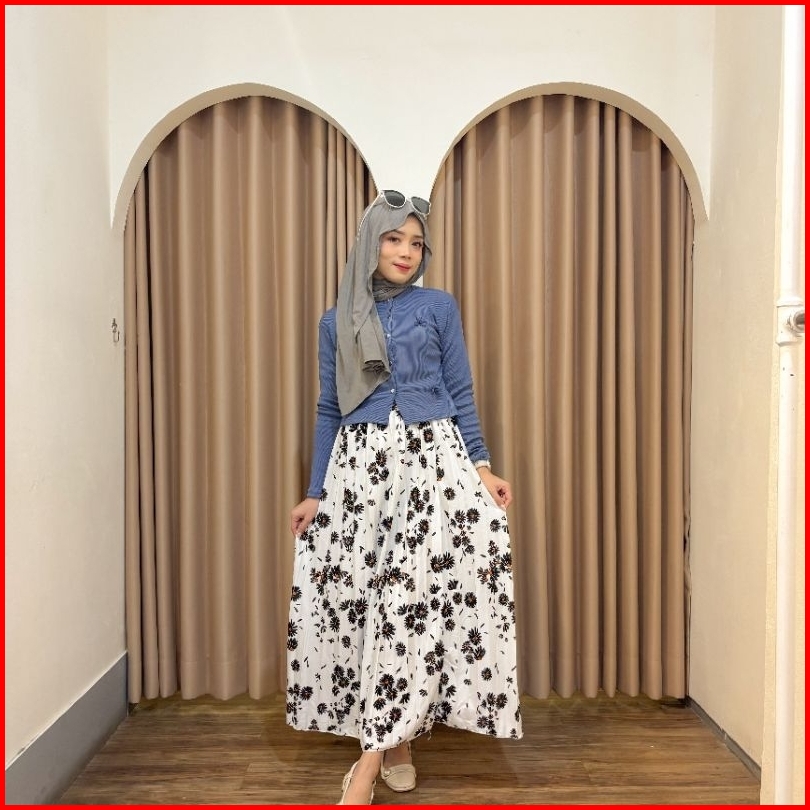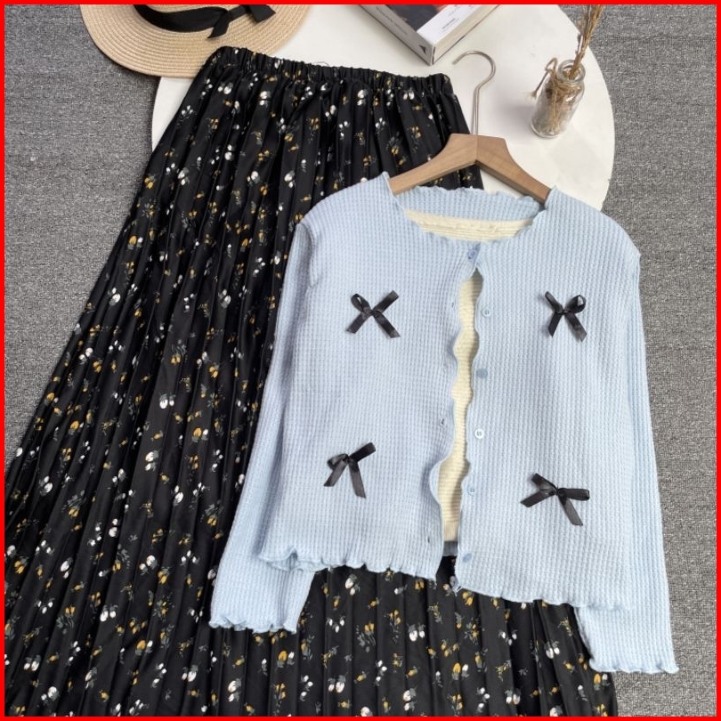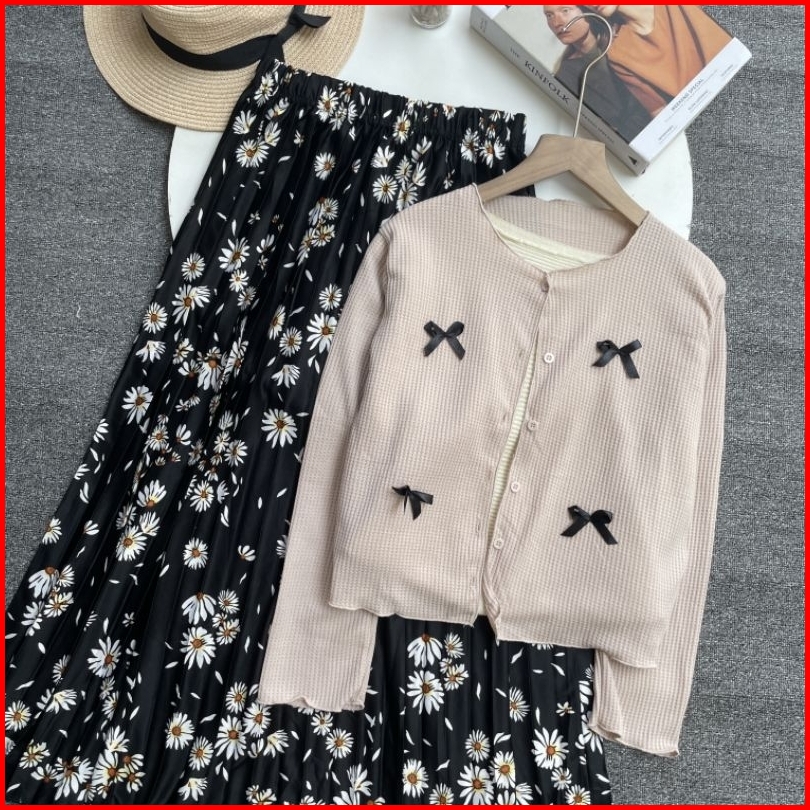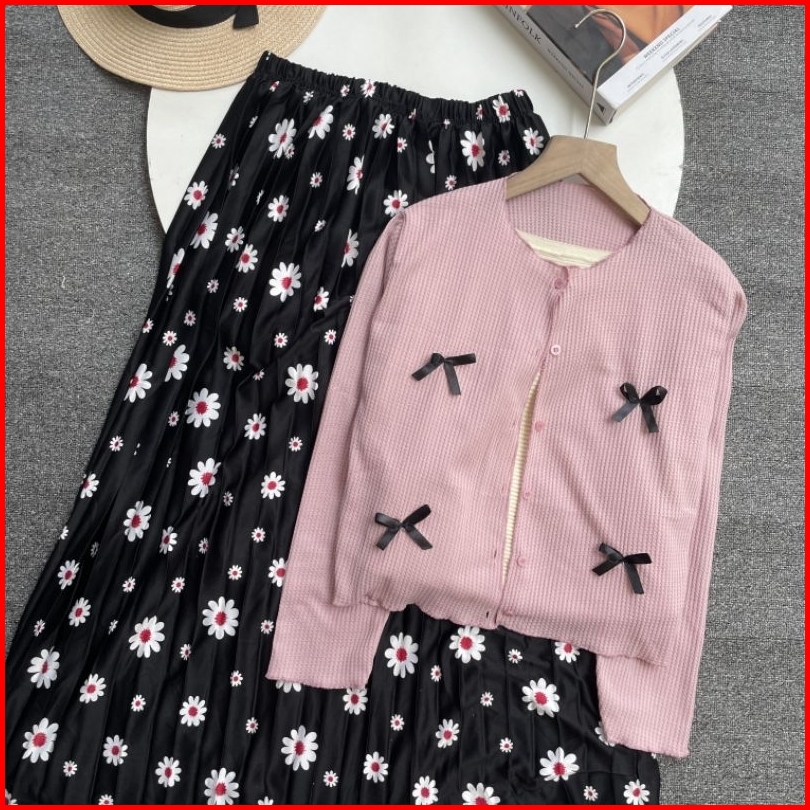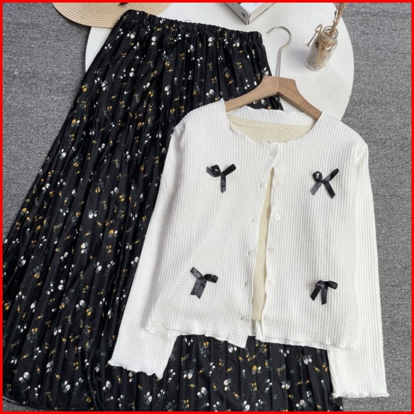 Violine Store - Oneset Setelan Wanita Remaja Kekinian Rok Panjang Atasan Cardi Pita Coquette Rok Plisket Motif Korean St