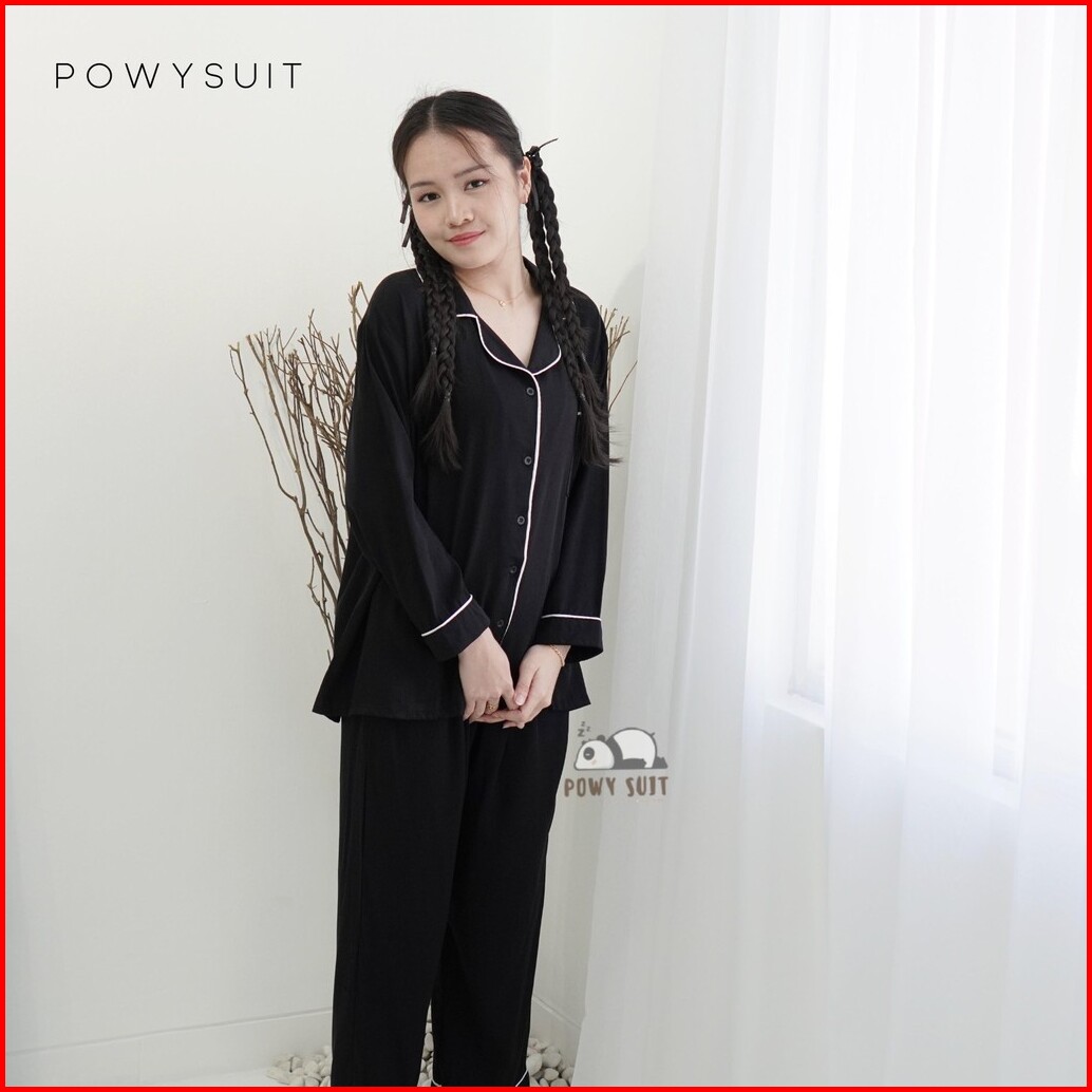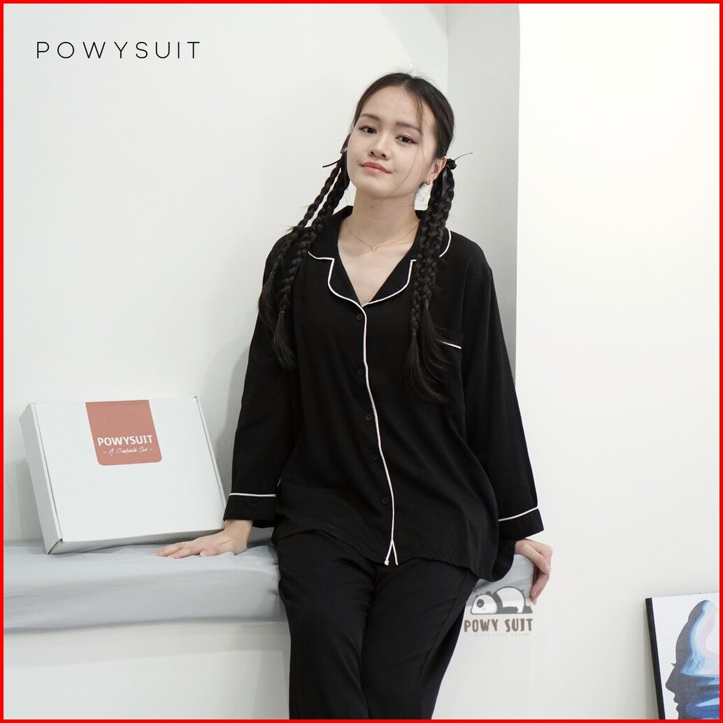 Powysuit Piyama Rayon Twill Wanita Motif Lis Lengan Panjang Dan Setelan Celana Panjang Kerah