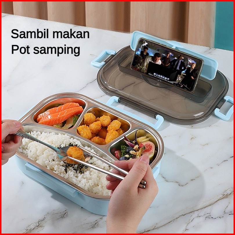 - Kotak Makanan Stainless Steel Food Grade 3 4 Sekat - 1000ml Dilengkapi Dengan Set Alat Makan Lengkap