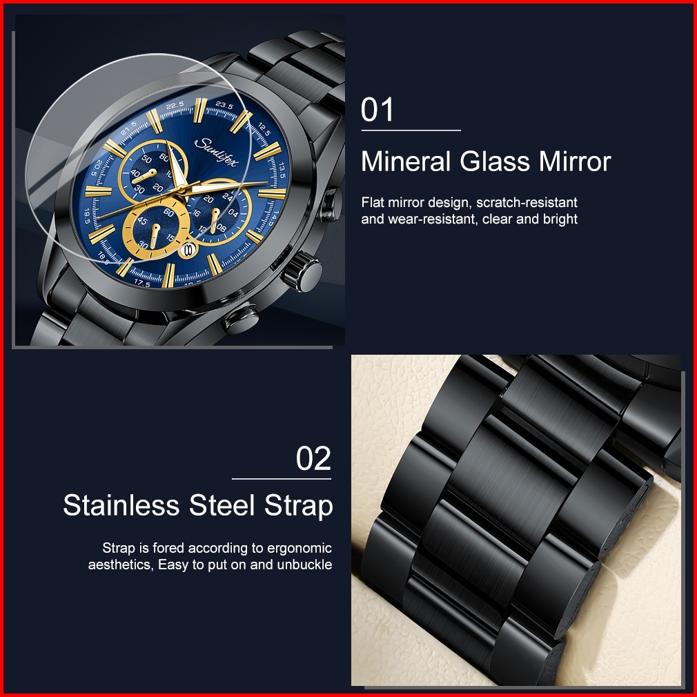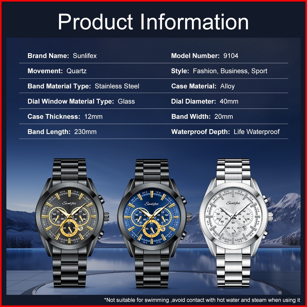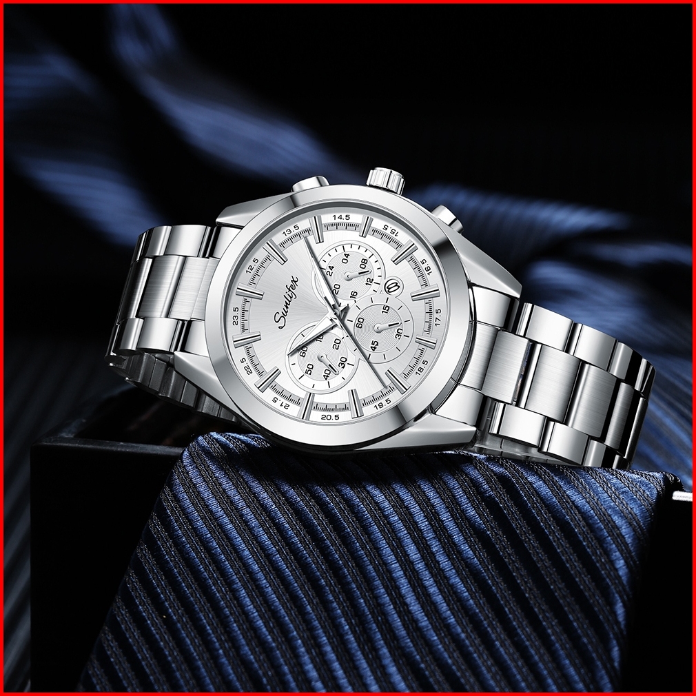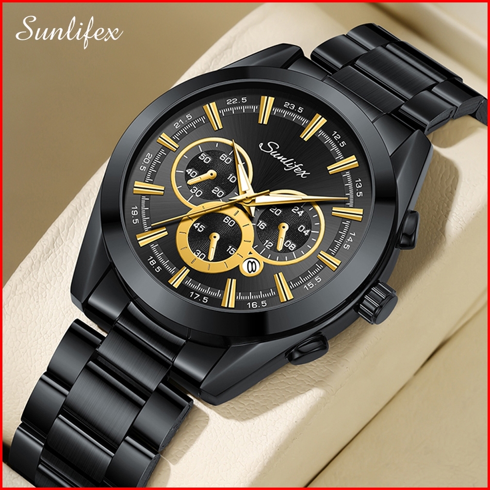 Sunlifex Jam Tangan Pria Kalender Santai Kuarsa Tali Stainless Steel Jam Tangan Cowok Original 9104