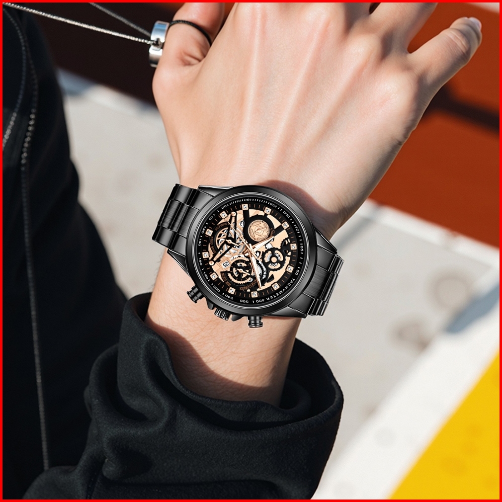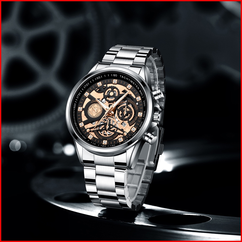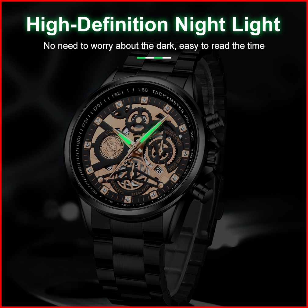 Sunlifex Jam Tangan Pria 3352 Bercahaya Dial Berongga Santai Mode Tali Stainless Steel Kalender Jam Tangan Cowok