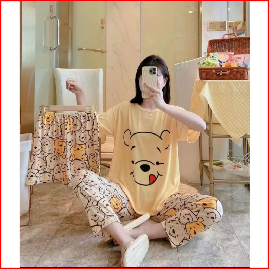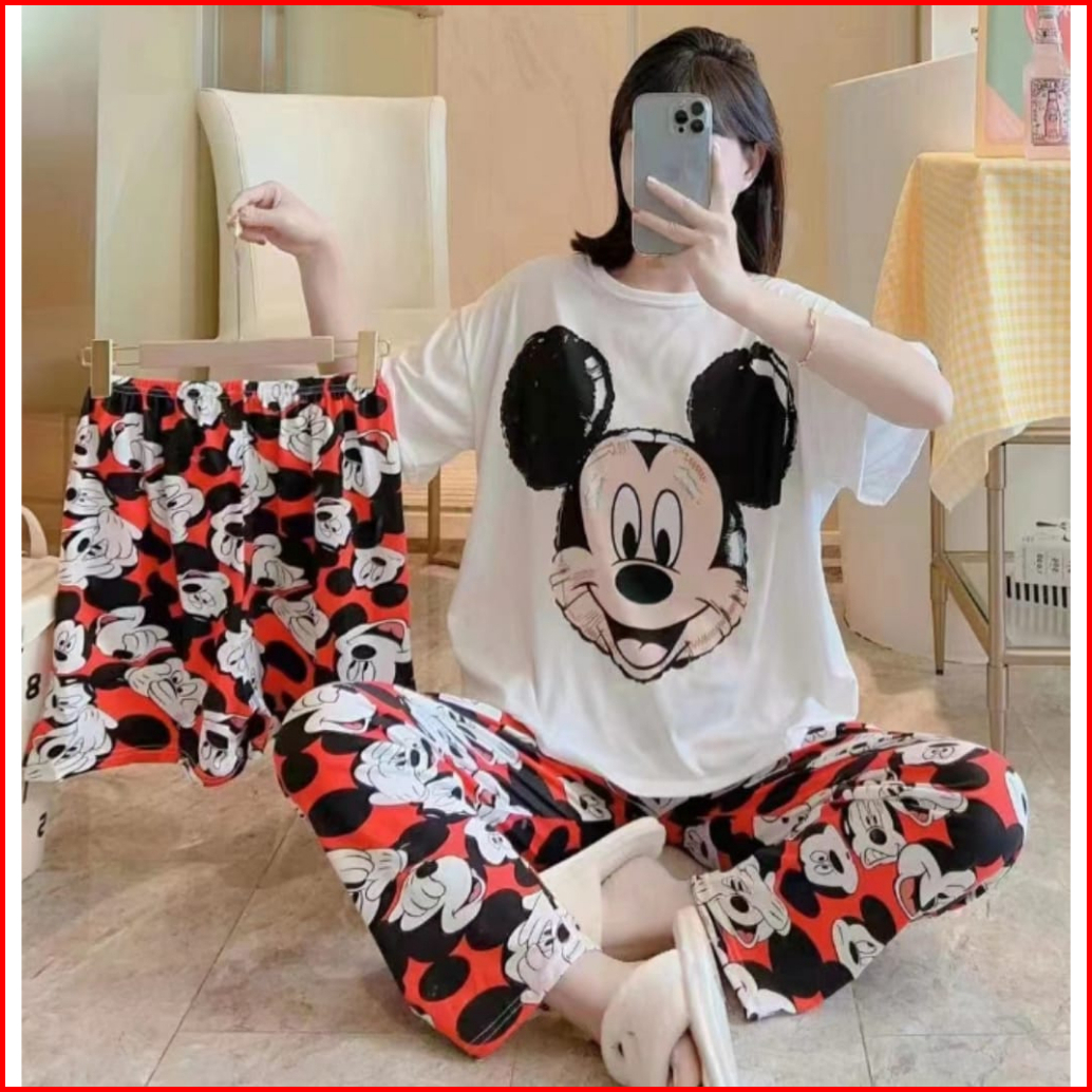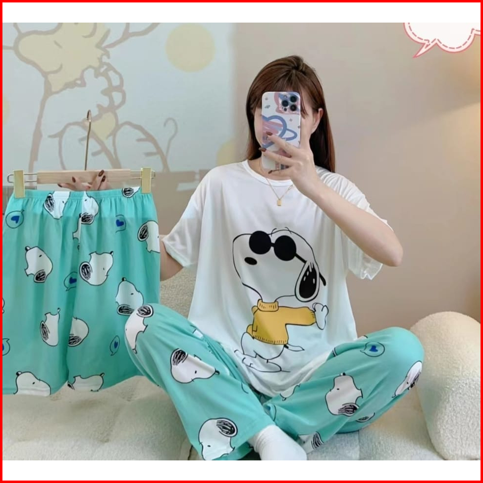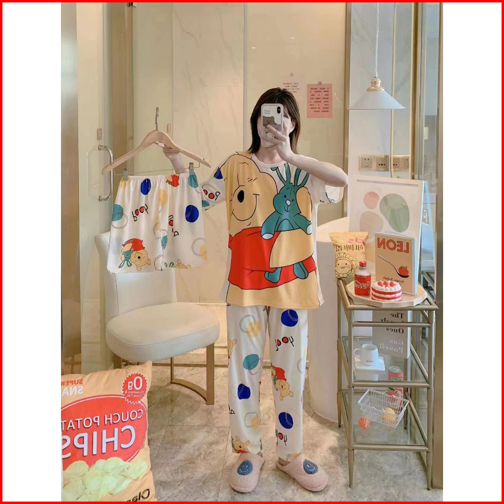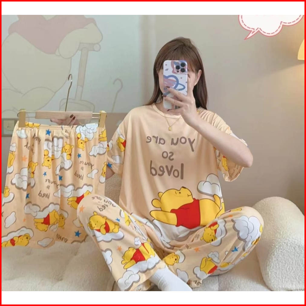Baju Tidur Setelan 3 In 1 Wanita Piyama Import Bahan Kaos Spandeks