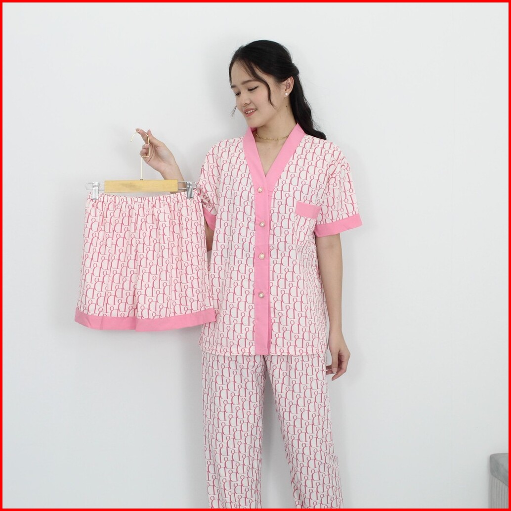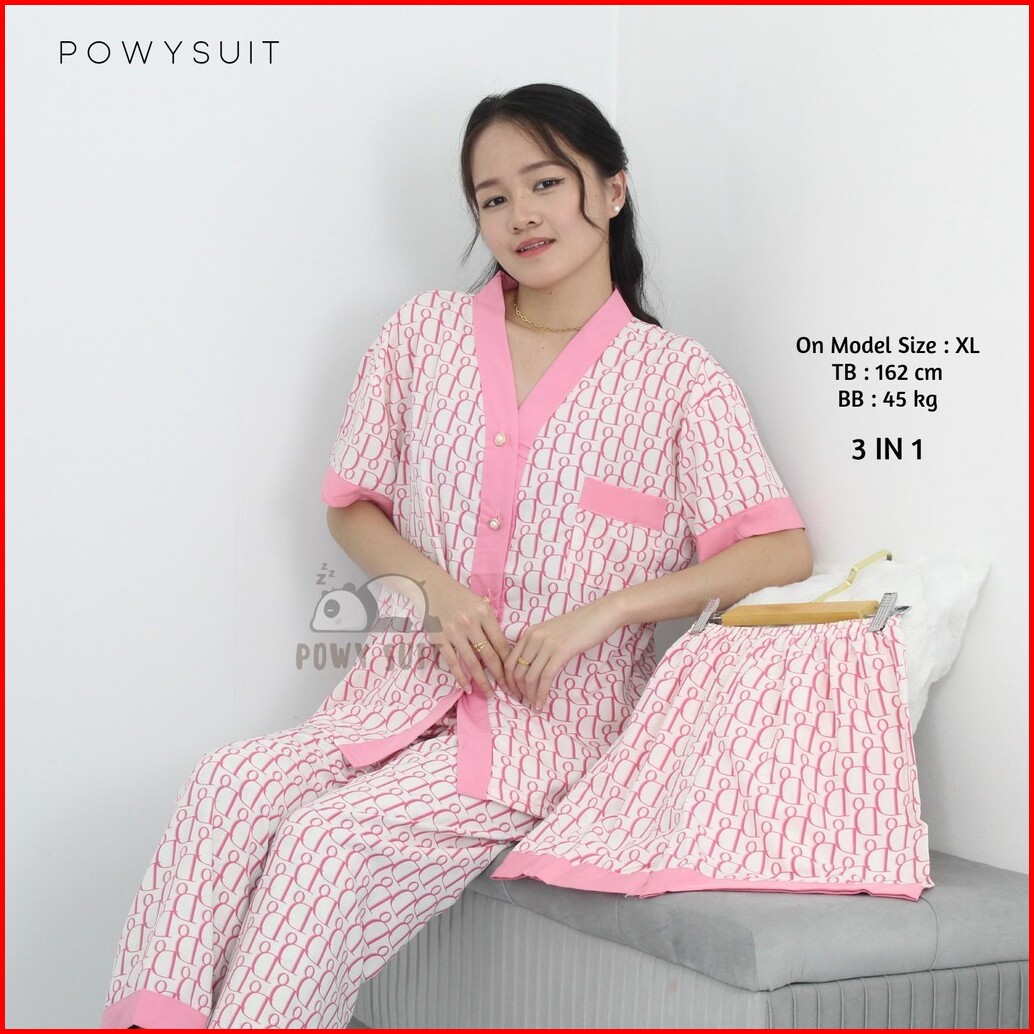 To21 Piyama 3 In 1 Dor Pink Powysuit Bahan Satin Silk Baju Tidur Wanita Dewasa Lembut Panjang Celana Setelan