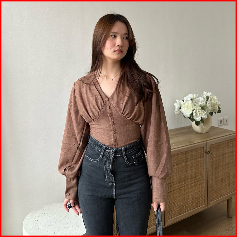 Soori Top Blouse Denim Wanita Korea Atasan Kantor Wanita Kasual Blouse Elegan Korea Blouse Hijab Friendly Blouse Lengan