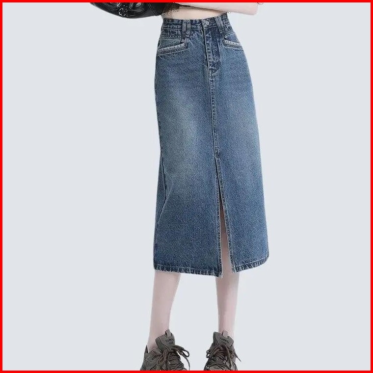 Mfm Denim Skirt Vintage S06 Rok Jeans Midi Biru Retro Korean Style Highwaist Kocek Two Tone A-line