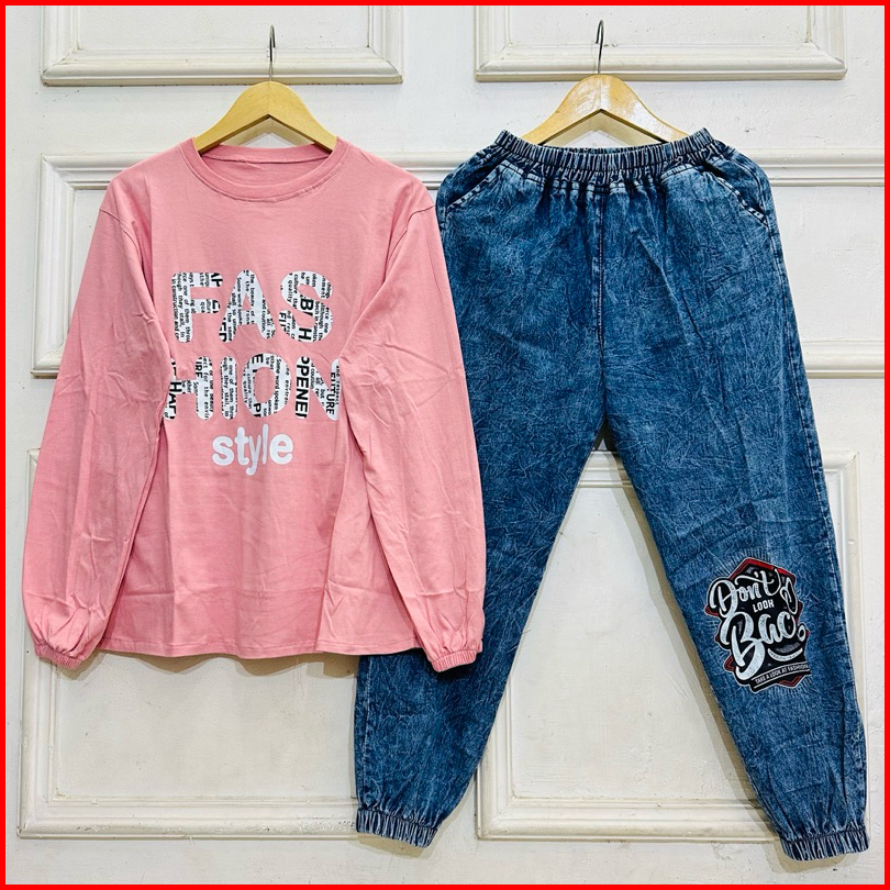 Setelan Celana Jeans Joger Jumbo Wanita Dewasa Atasan Combed 24s Motif Sablon Celana Jeans Joger Setelan Wanita Kekinian