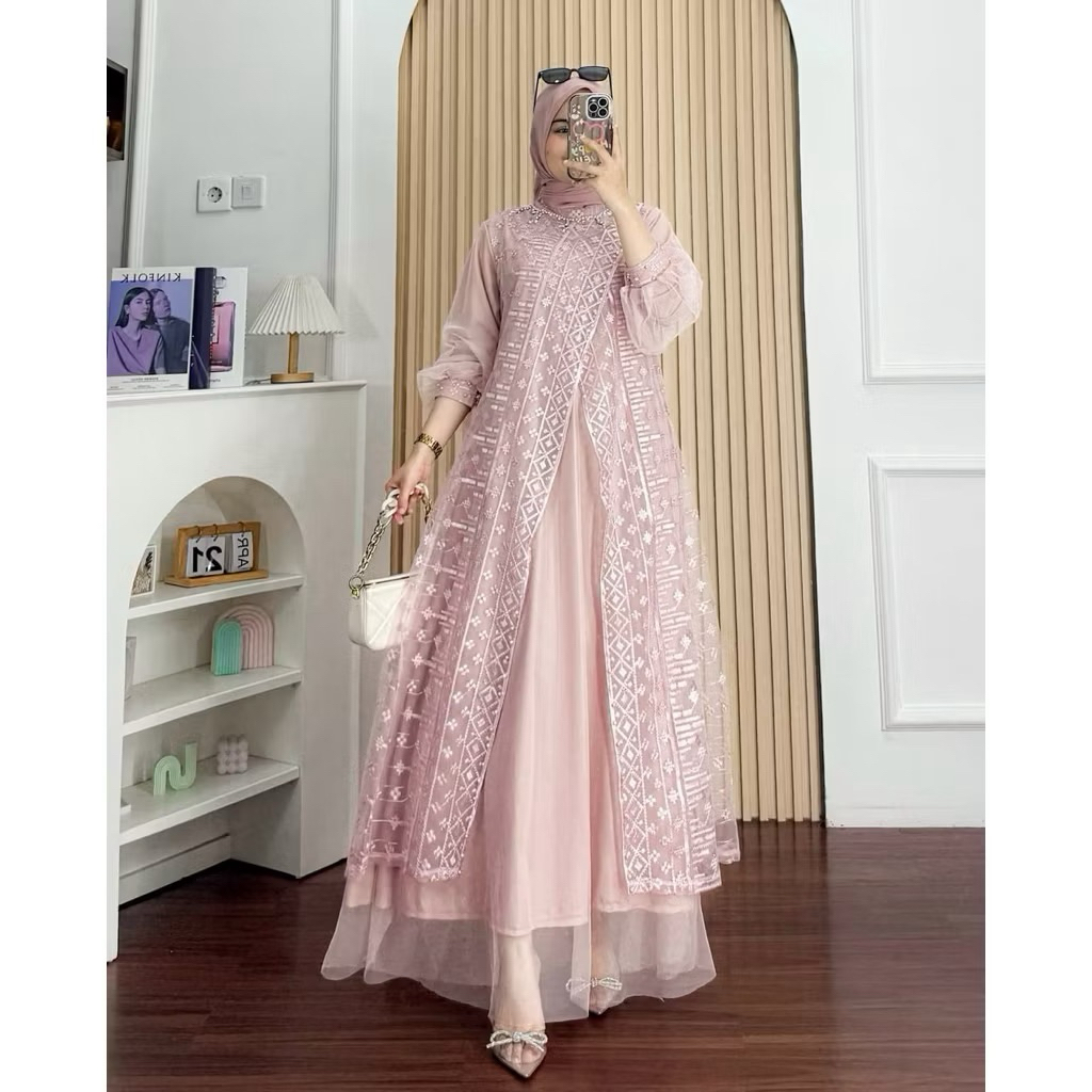 RadikaOlshop_Keyla Dress Gaun Pesta Muslimah Terbaru Bahan Tile Mix Brukat Mutiara