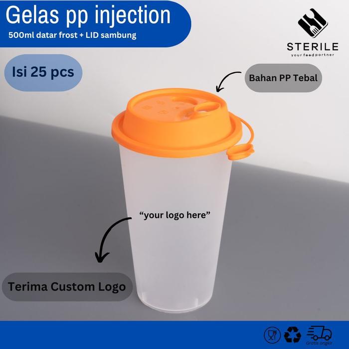 Terlaris GELAS THINWALL DATAR FROSTED 500 ML 16 OZ + TUTUP ISI 25 PCS / GELAS PP INJECT - HITAM Keren
