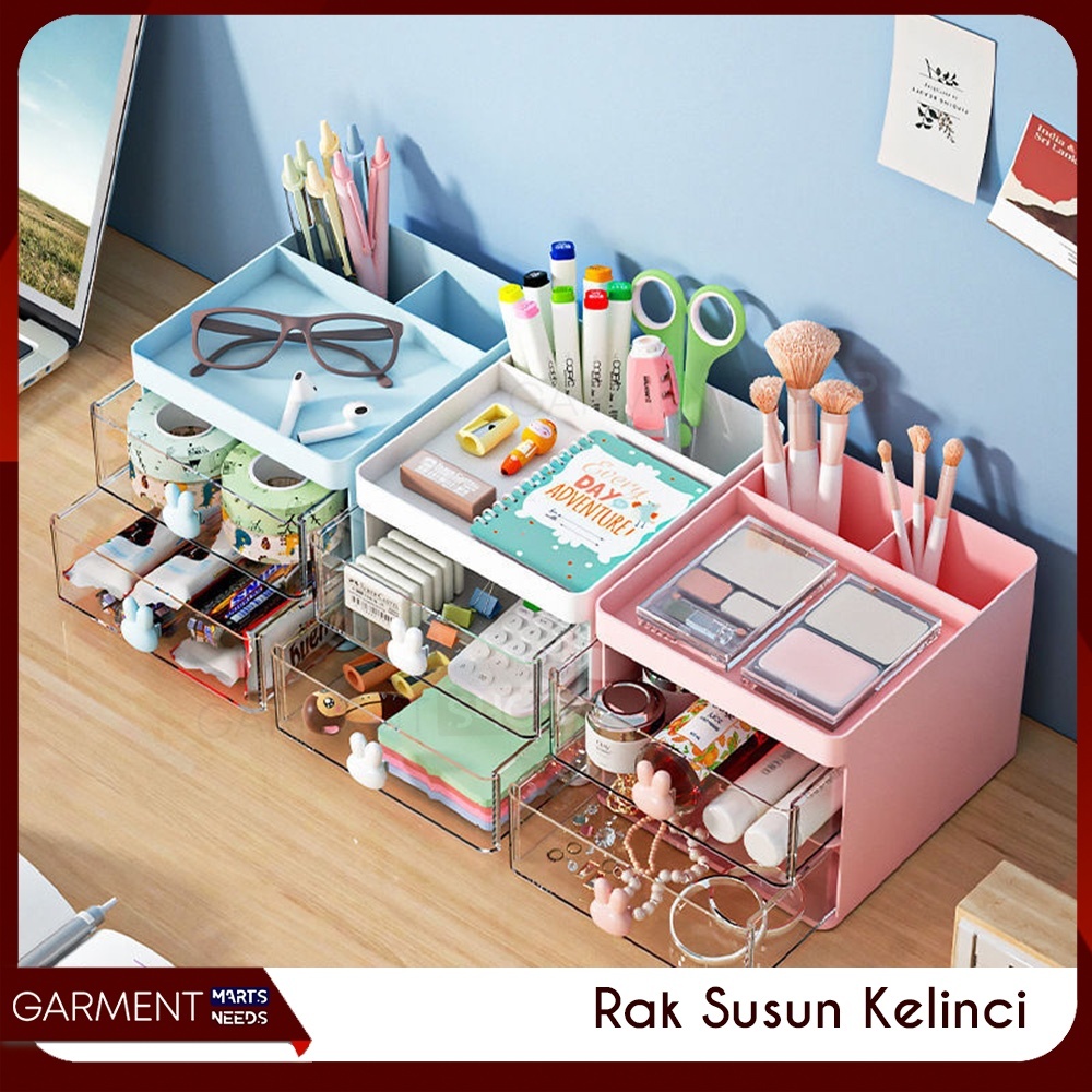 Laci Mini 2 Susun Tempat Penyimpanan Alat Tulis Meja Stationery Rak Laci Tarik Motif Kelinci Estetik