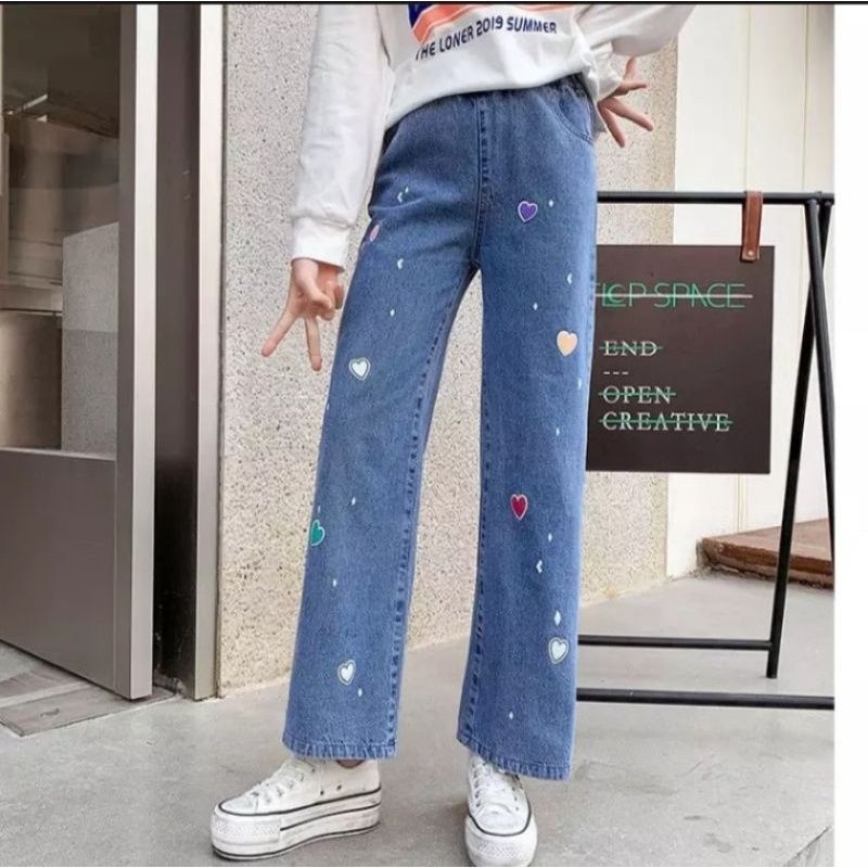CELANA KULOT LOSSE ANAK-ANAK TANGGUNG MOTIF BORDIR LOVE PERCAK/Celana Jeans Anak/Kids denim Palazzo girl/Kulot Anak Rema