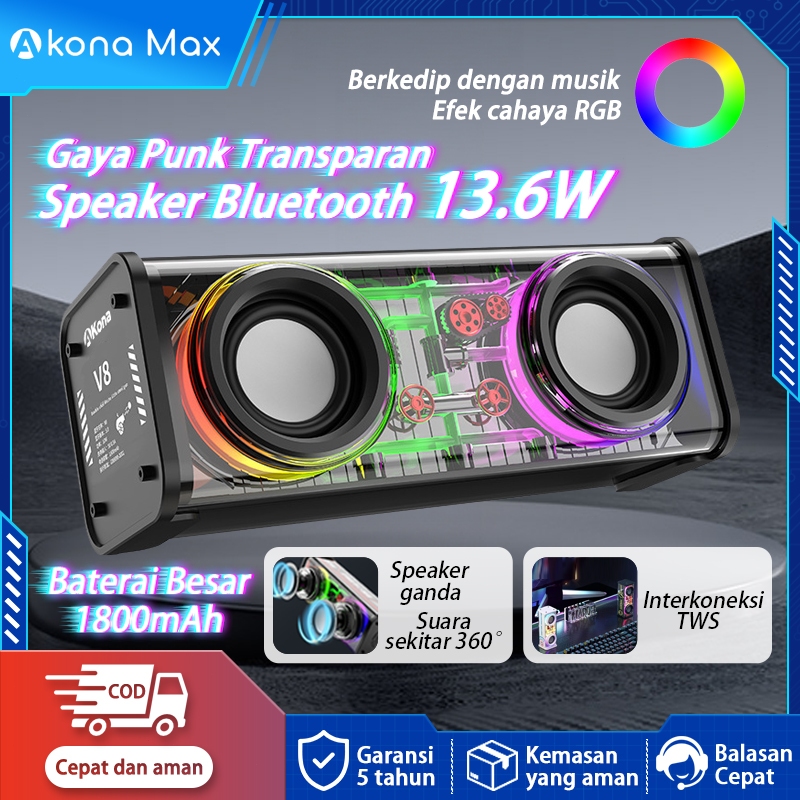 Akona Speaker Bluetooth Cyberpunk 13.6W Daya Tinggi Speaker Bass Bluetooth RGB LED Light Akrilik Transparan V8 Spiker Bl