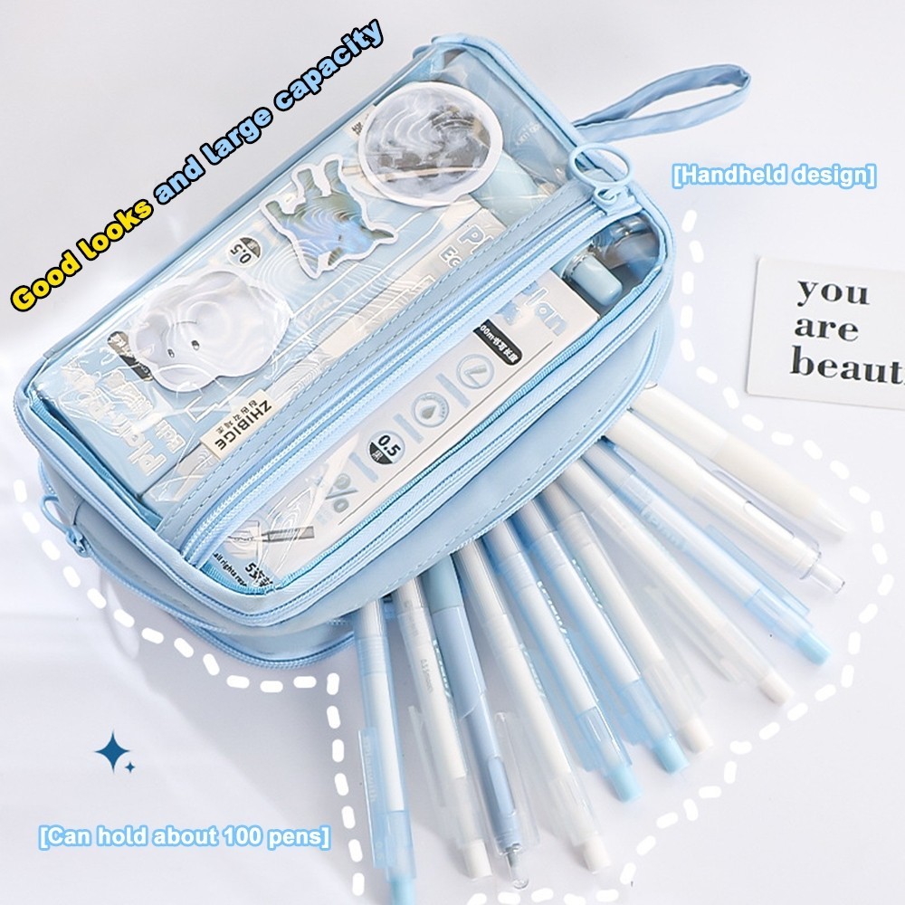 [DOTDING] Kotak Pensil Transparan Aesthetic Korean Style - Desain Unik 3 Lapis Zipper Kapasitas 40+ Pensil/Transparent