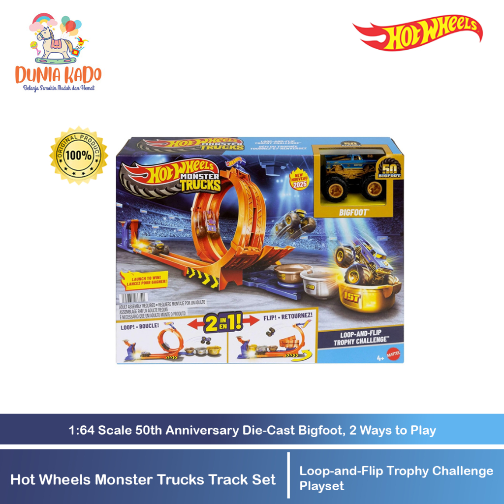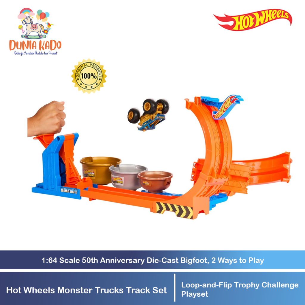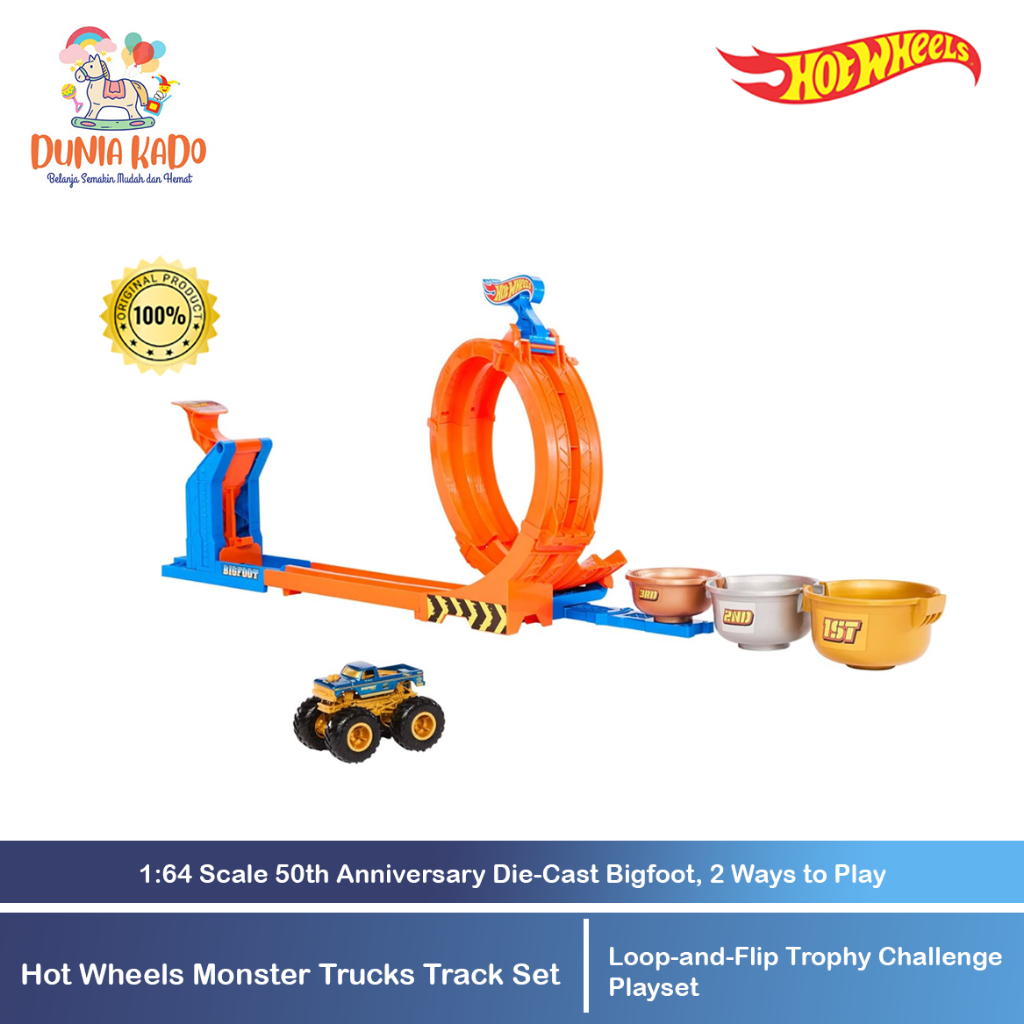 Hot Wheels Monster Trucks Toy Truck & Track Set, Loop-and-Flip Trophy Challenge Playset & 1:64 Scale 50th Anniversary Di