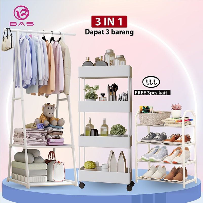 BAS combo 3 in 1 cicilan triangle rak baju mutifunsi + rak susun serbaa dengan roda + rak sepatu 4 tingkat