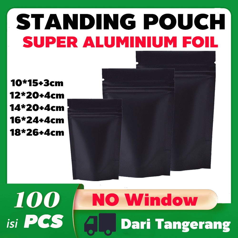 KEMASAN STANDING POUCH FULL ALUMUNIUM PLASTIK KLIP KEMASAN isi 100pcs Hitam