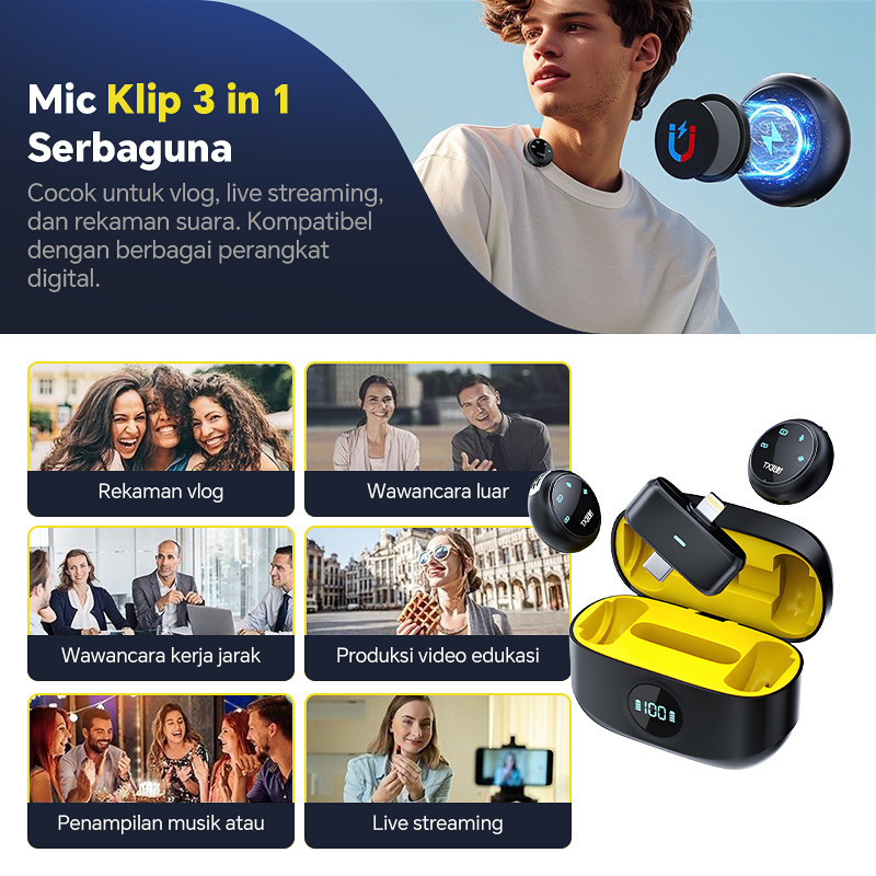Microphone A37/K31 Pro 2-in-1 Wireless Lavalier iOS Type C Clip On Mic Magnetik Plug & Play untuk HP