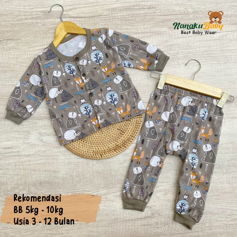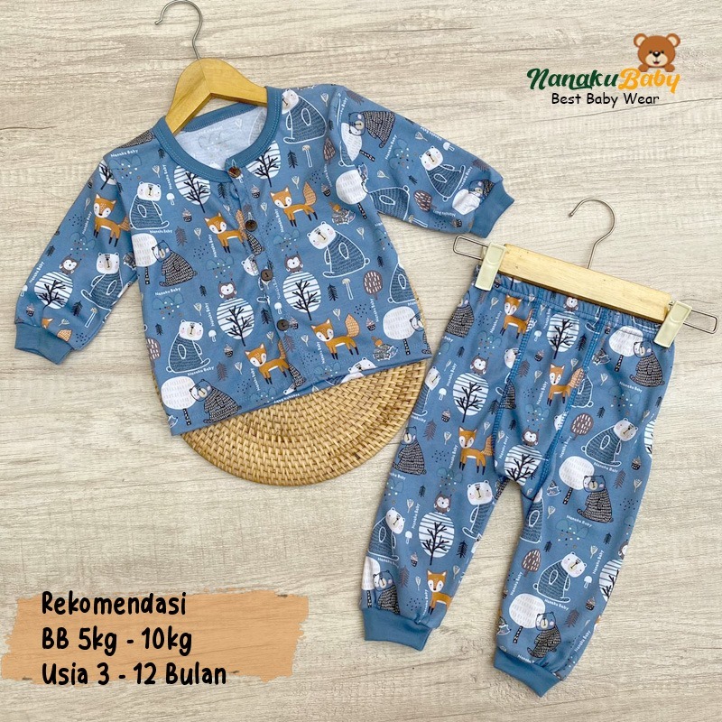 Nanaku Baby - Setelan Piyama Bayi Panjang Kancing Depan Motif Printing Burung Hantu Usia 3-12 Bulan