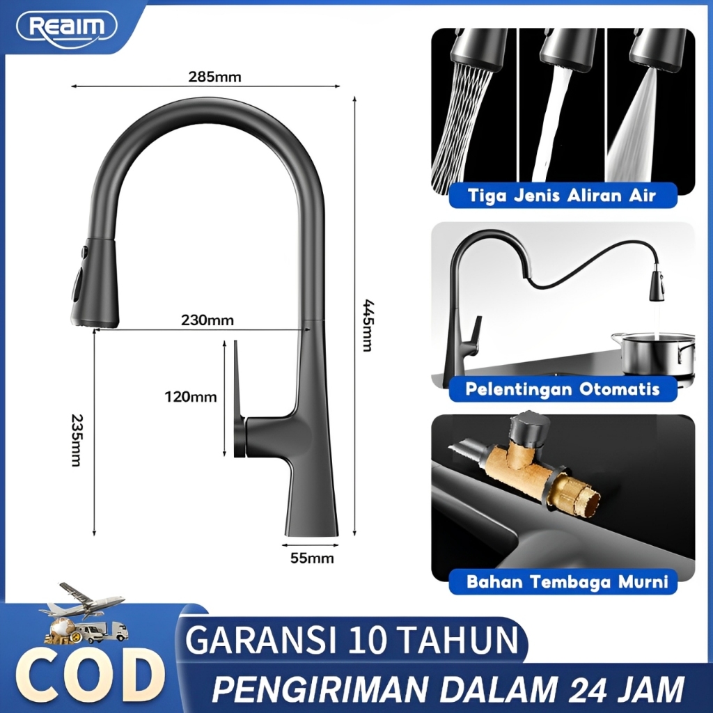 [PROMO] REAIM Kran Air Angsa Fleksibel 3 Mode kran cuci piring Angsa otasi putar 360° arah kemana saja dinding Kran