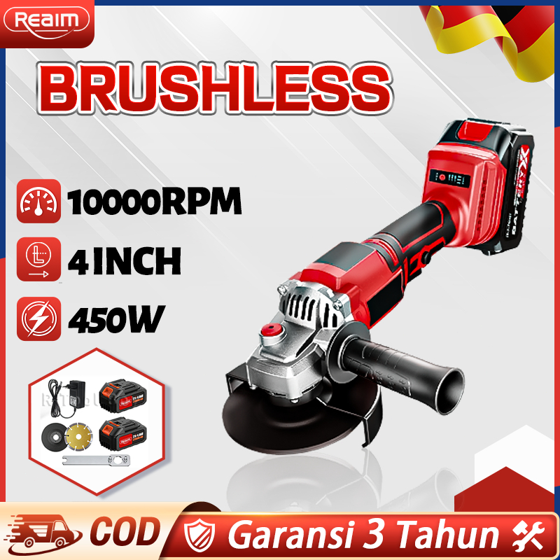 REAIM Angle Grinder Cordless Brushless 4Inch 450W - Gerinda Modern Portable dengan Baterai Lithium, Tahan Lama & Efisien