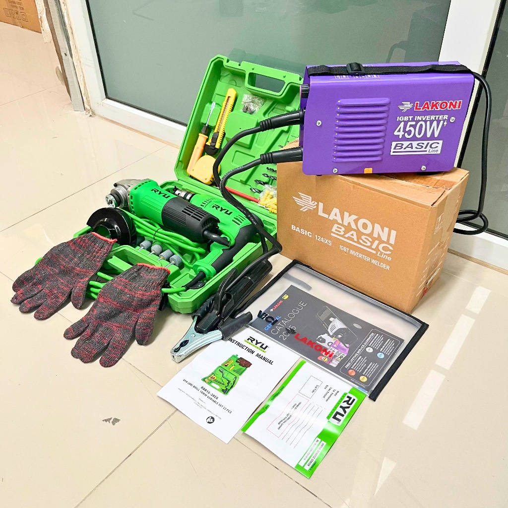 PAKET HEMAT 3 ITEM MESIN LAS LAKONI 450W - GERINDA TANGAN 4" RYU -BOR 10 MM FULL SET KOPER RYU