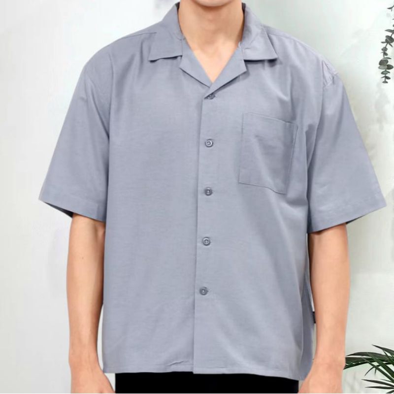 kemeja REINLUB Cuban Bowling Boxy Oversized Linen Shirt | Kemeja Linen Bowling Polos Pria Kerah Terbuka Lengan Pendek |