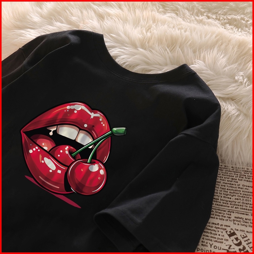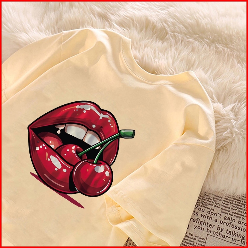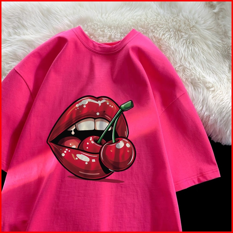 Yesgirl Mulut Ceri Cetak Kaos Kasual Longgar Kaos Oversize Wanita Fashion Korean Style Baju Kaos Oversize Baju Atasan