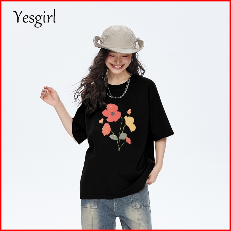 Yesgirl Korea Style Bunga Berwarna-warni Print Kaos Kasual Longgar Kaos Oversize Wanita Fashion Korean Style Baju Kaos O