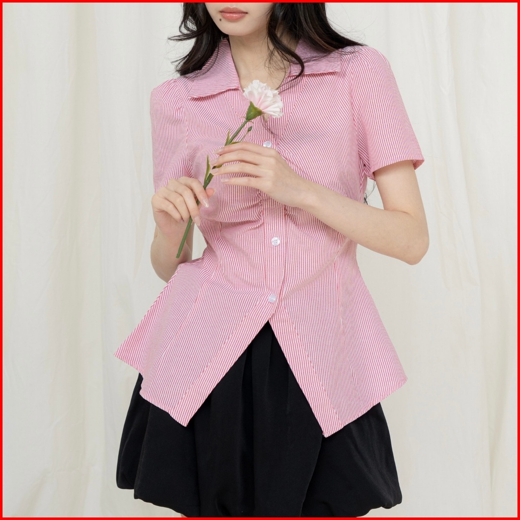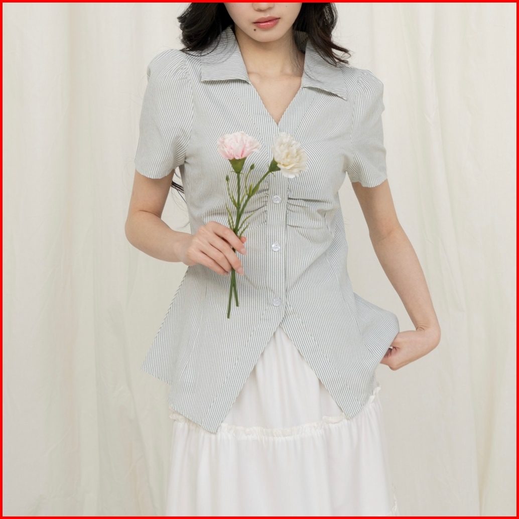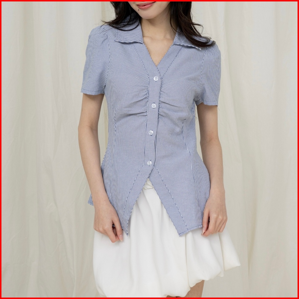Asoka Kyla Shirt 3006 - Kemeja Wanita Lengan Pendek Kekinian - V-neck Fitted Shirt Stripe Ruched