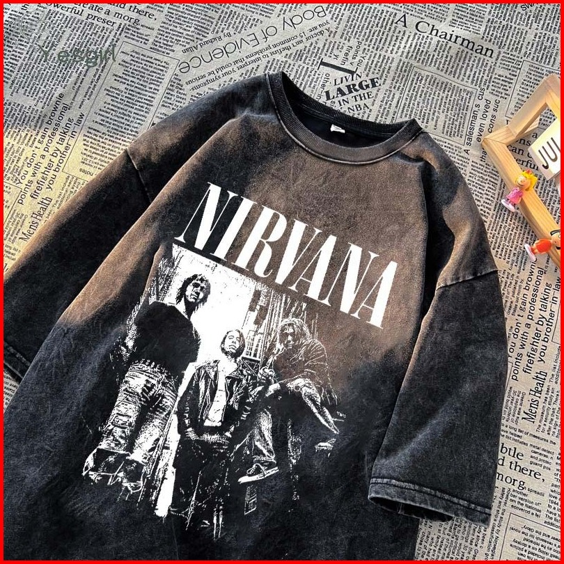 Yesgirl Band Nirvana Antik Bergaya Netral T Shirt Pria Atasan Washed Hitam Cowok Asli 100 Retro Street Style Kere