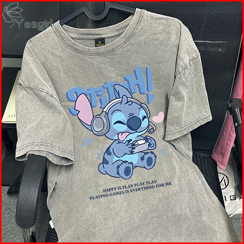 Yesgirl Korea Style Happy Stitch Print Kaos Kasual Longgar Kaos Oversize Wanita Fashion Korean Style Baju Kaos Oversize