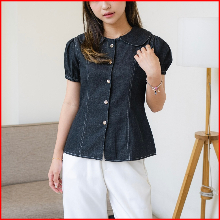 Asoka Lumora Top 2570 - Contrast Stitch Denim Shirt Short Puff Sleeve - Petter Pan Collar Top