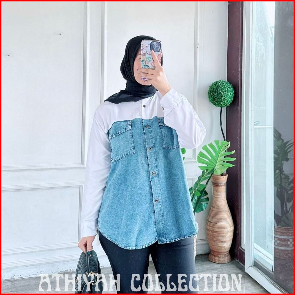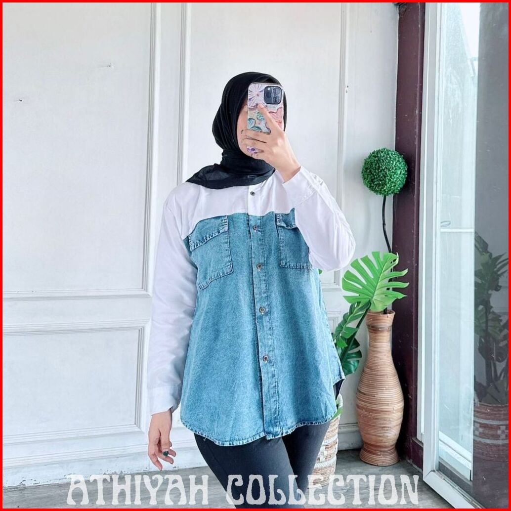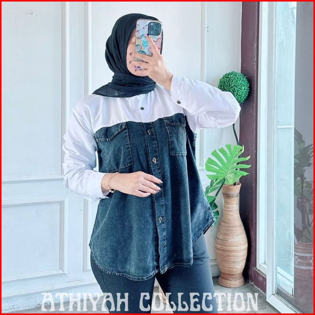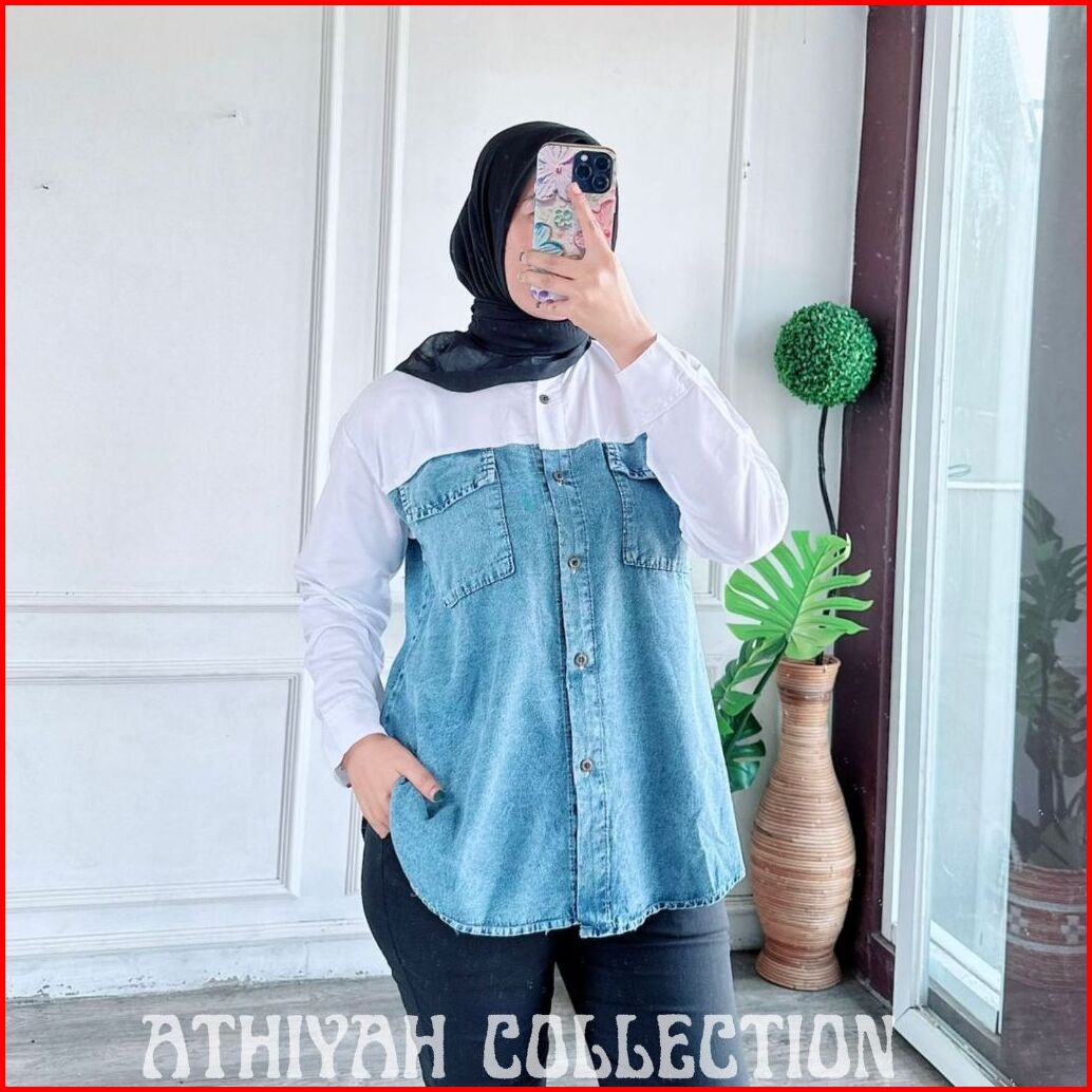 Athiyah - Kemeja Wanita Jeans Kombinasi Katun Ld 100-110cm Atasan Jeans Kombinasi Katun