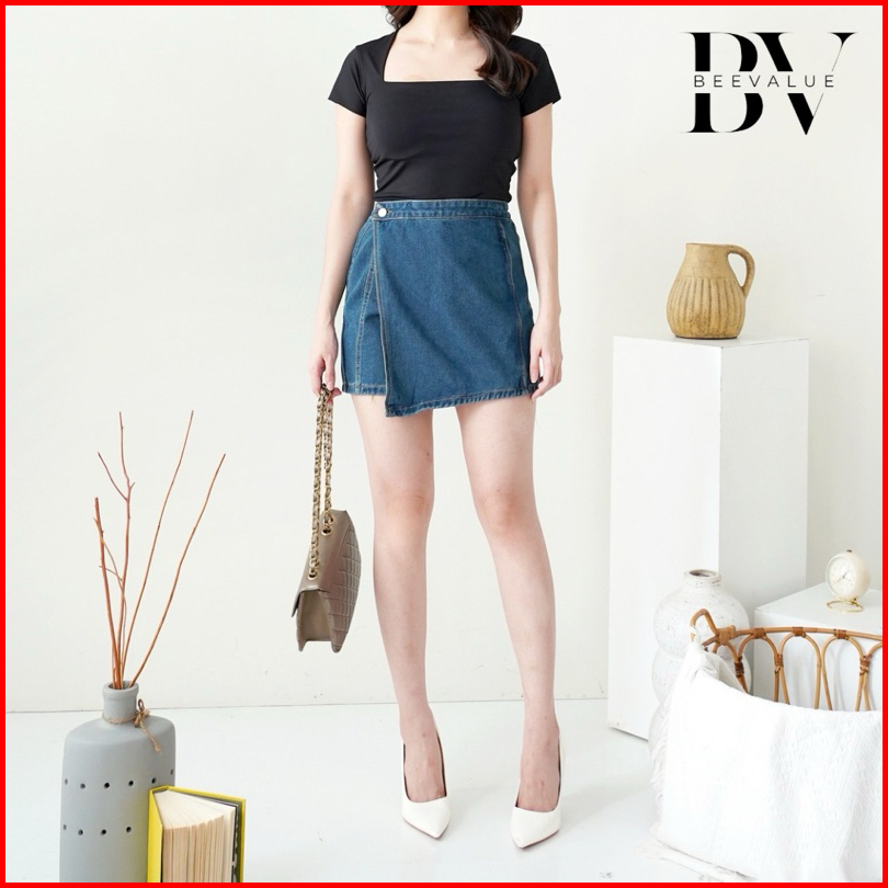 Beevalue - Rok Celana Jeans Wanita Skort Highwaist Pinggang Karet Bahan Denim Premium Korean Look Mini Skort Bv610