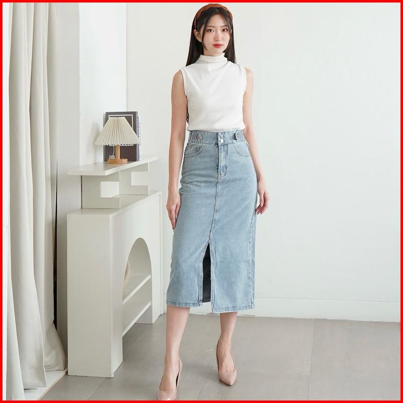 Beevalue Midi Split Skirt Rok Jeans Highwaist Dua Kancing Variasi Belt Bahan Premium Rok Jeans Belah Tengah Panjang Midi