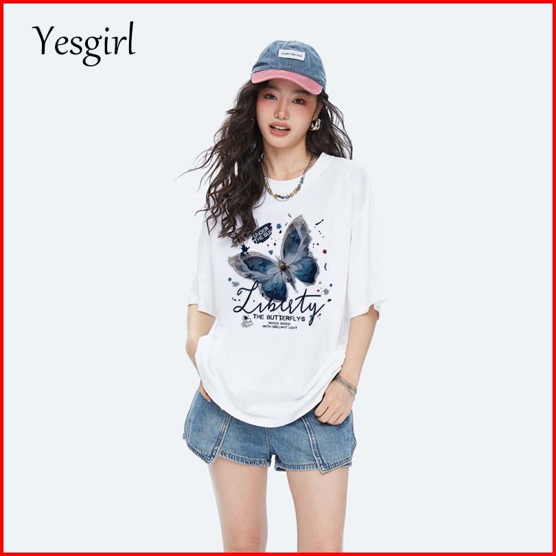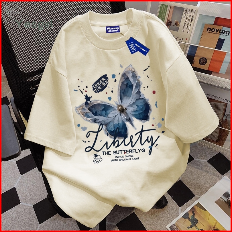 Yesgirl Korea Style Vintage Blue Butterfly Print Kaos Kasual Longgar Kaos Oversize Wanita Fashion Korean Style Baju Kaos