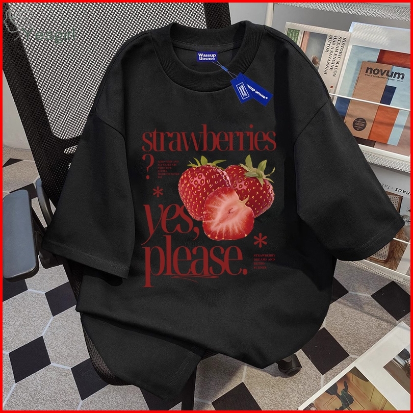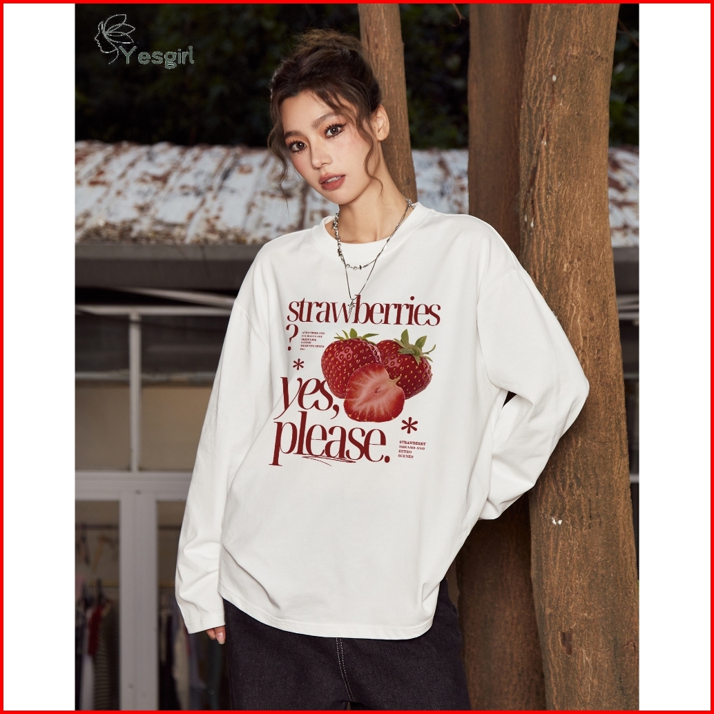 Yesgirl Korea Style Please Eat Strawberries Print Kaos Kasual Longgar Lengan Panjang Oversize Wanita Busana Gaya Korea L