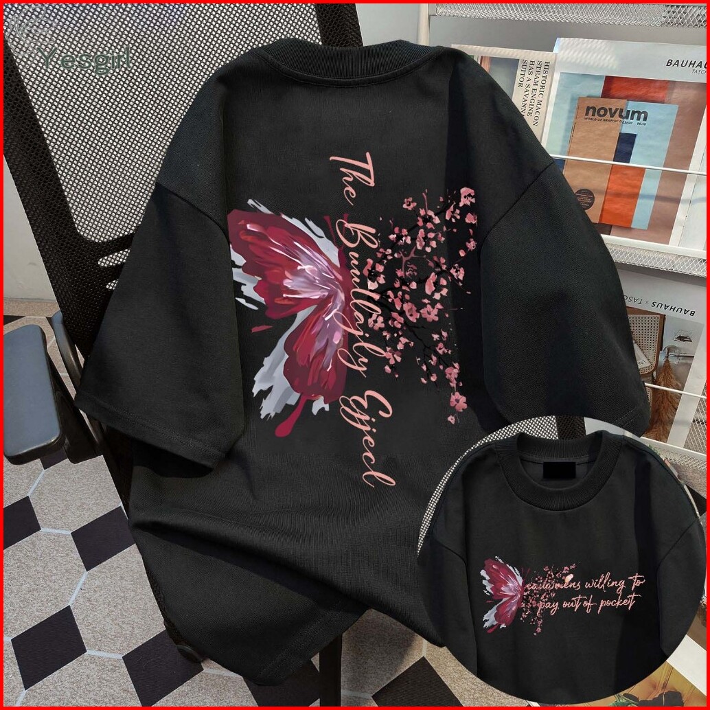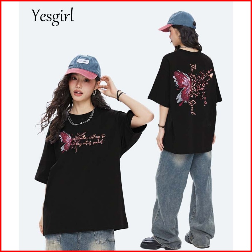 Yesgirl Korea Style Kupu-kupu Bunga Plum Print Kaos Kasual Longgar Kaos Oversize Wanita Fashion Korean Style Baju Kaos O