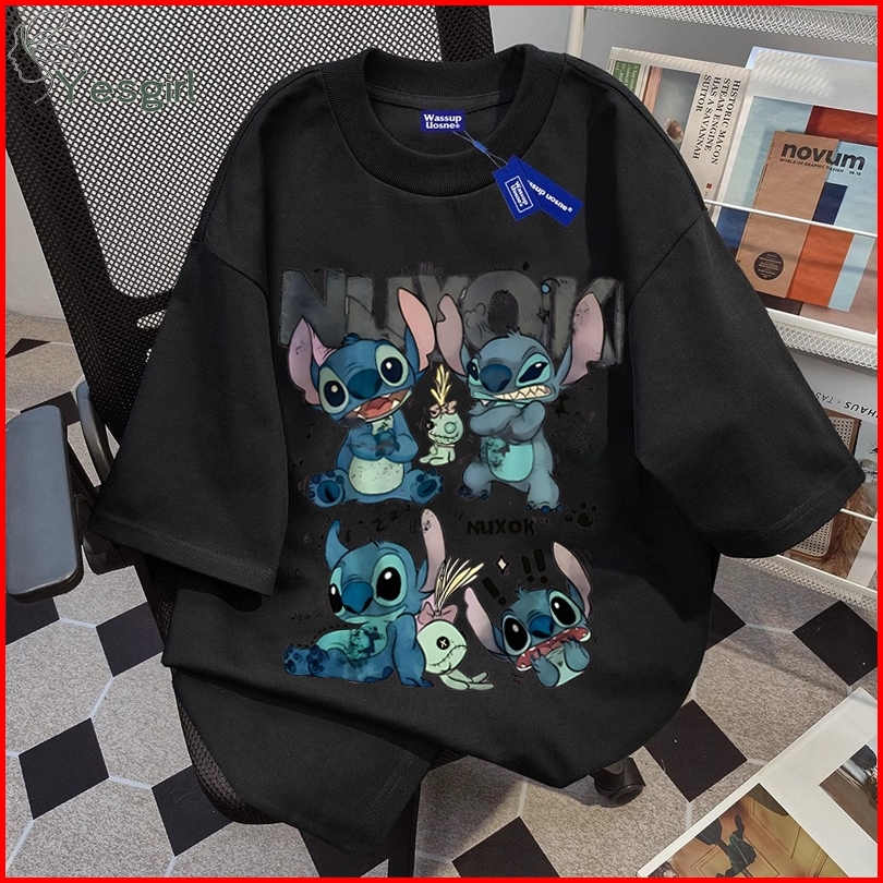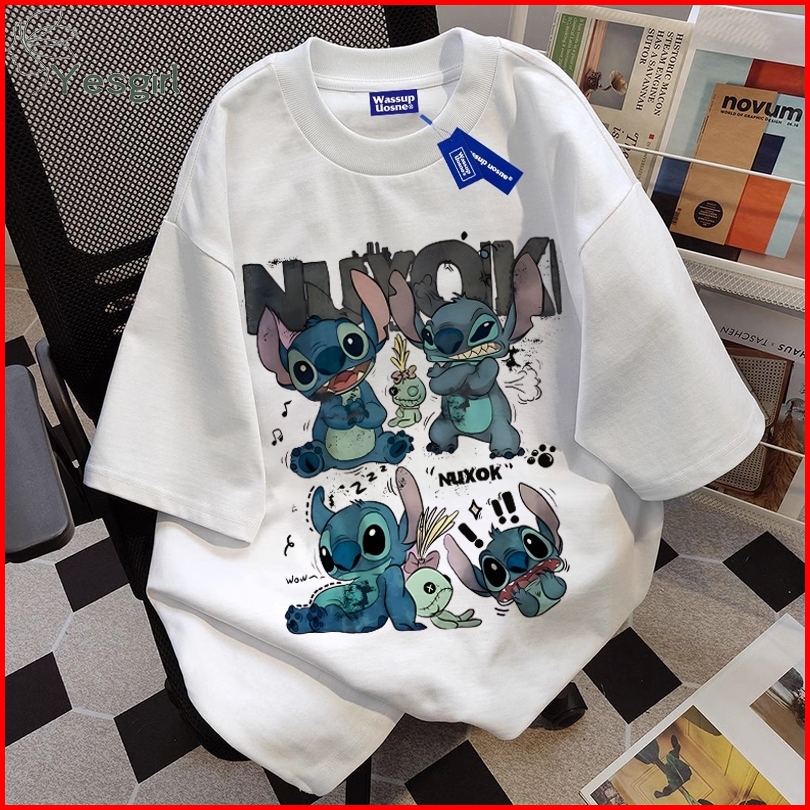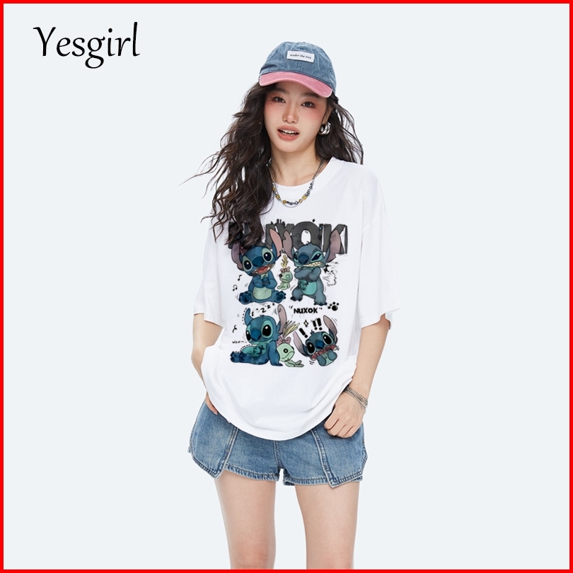 Yesgirl American Retro Style Cartoon Stitch Print Kaos Kasual Longgar Kaos Oversize Wanita Fashion Korean Style Baju Kao