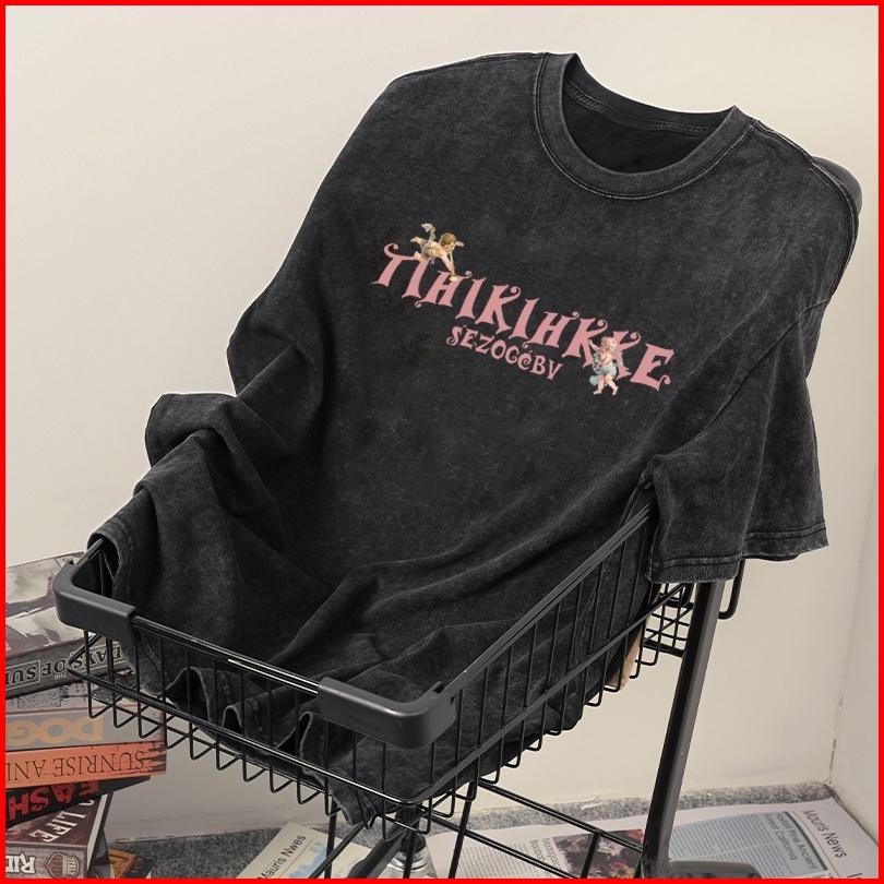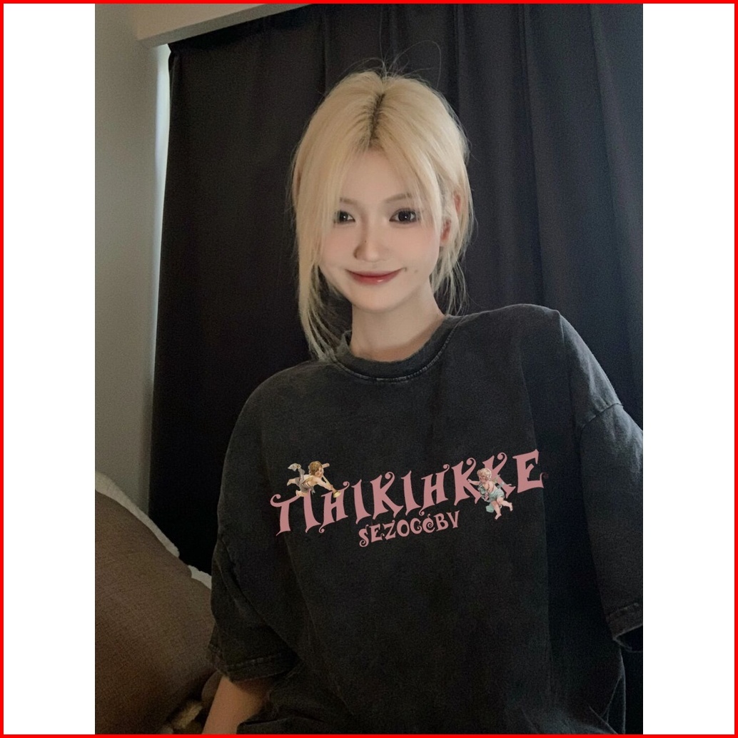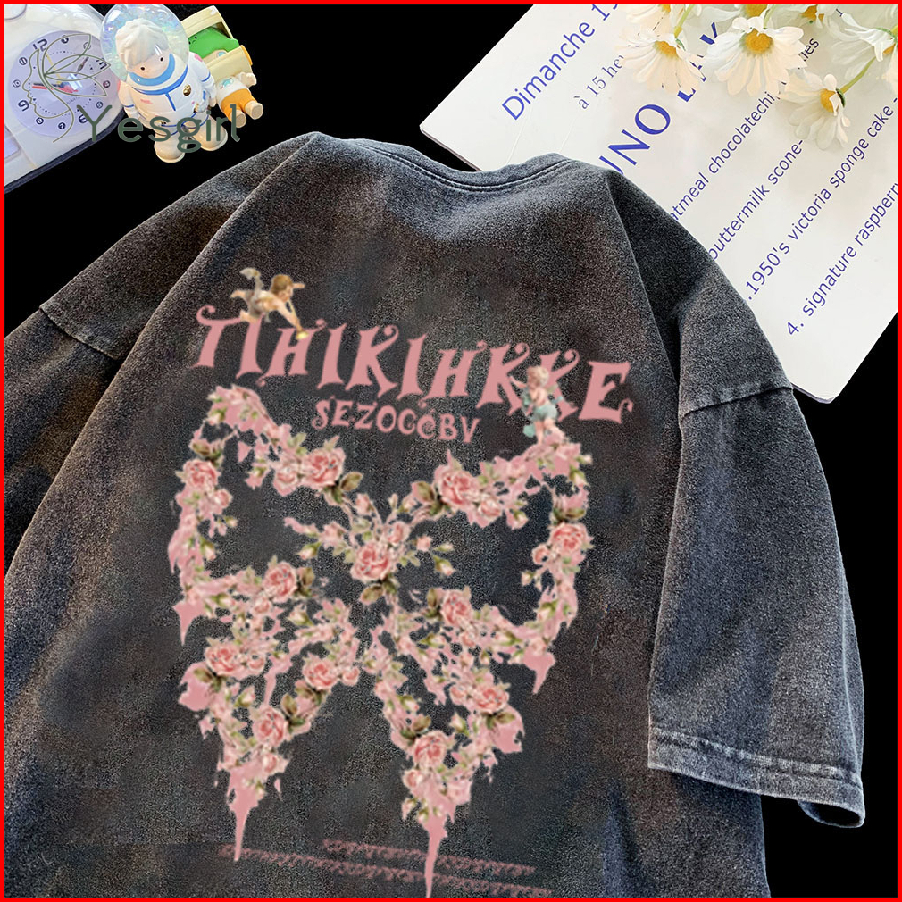 Yesgirl Washed T-shirt Oversize Lengan Pendek Kaos Flower Butterfly Katun Murni Wanita 2.21