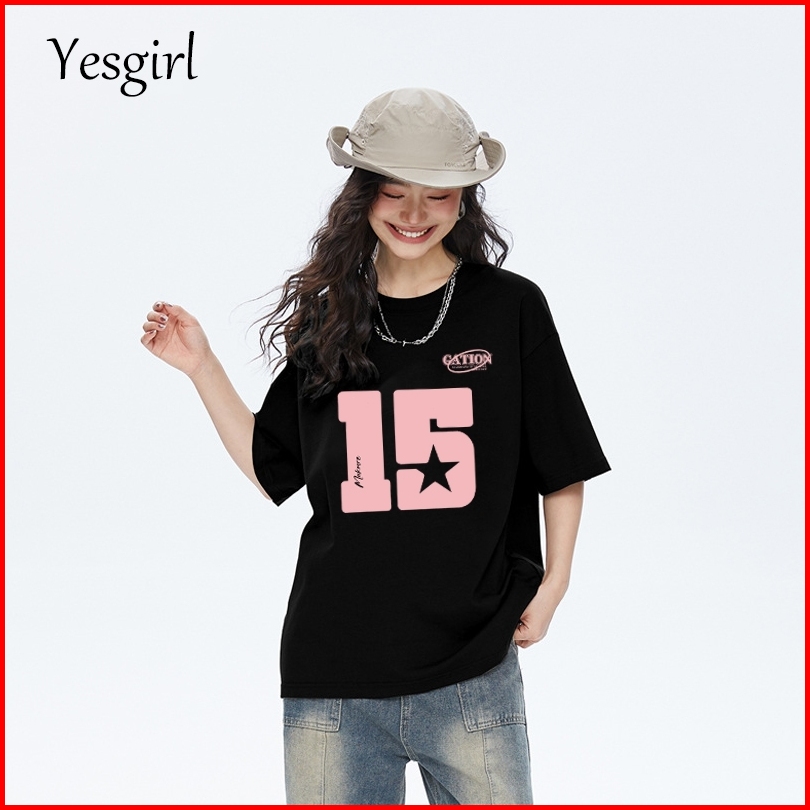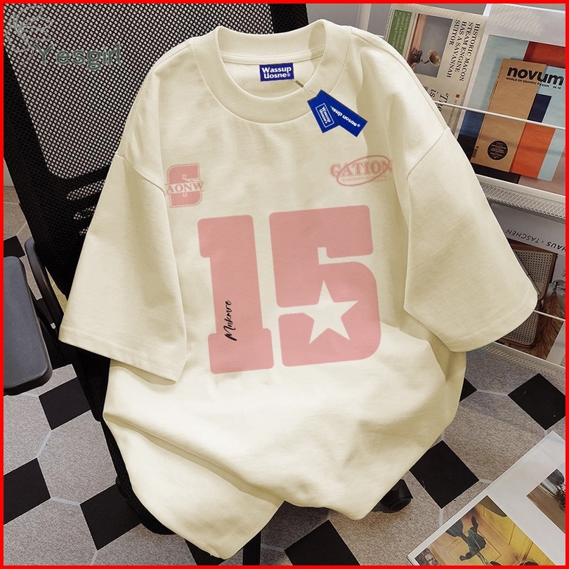 Yesgirl Korea Style Cetakan Angka 15 Berwarna Merah Muda Kaos Kasual Longgar Kaos Oversize Wanita Fashion Korean Style B