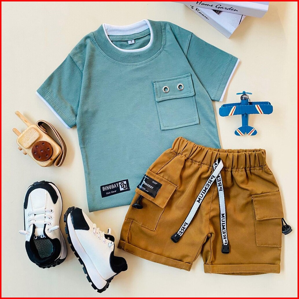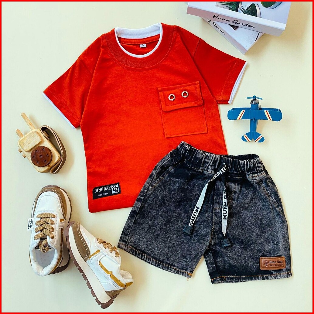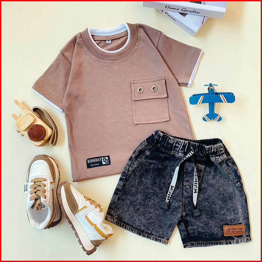 Estishop X Dinoday Setelan Baju Anak Laki Laki Kaos Saku Polos Celana Jeans Pendek 1 - 9 Tahun